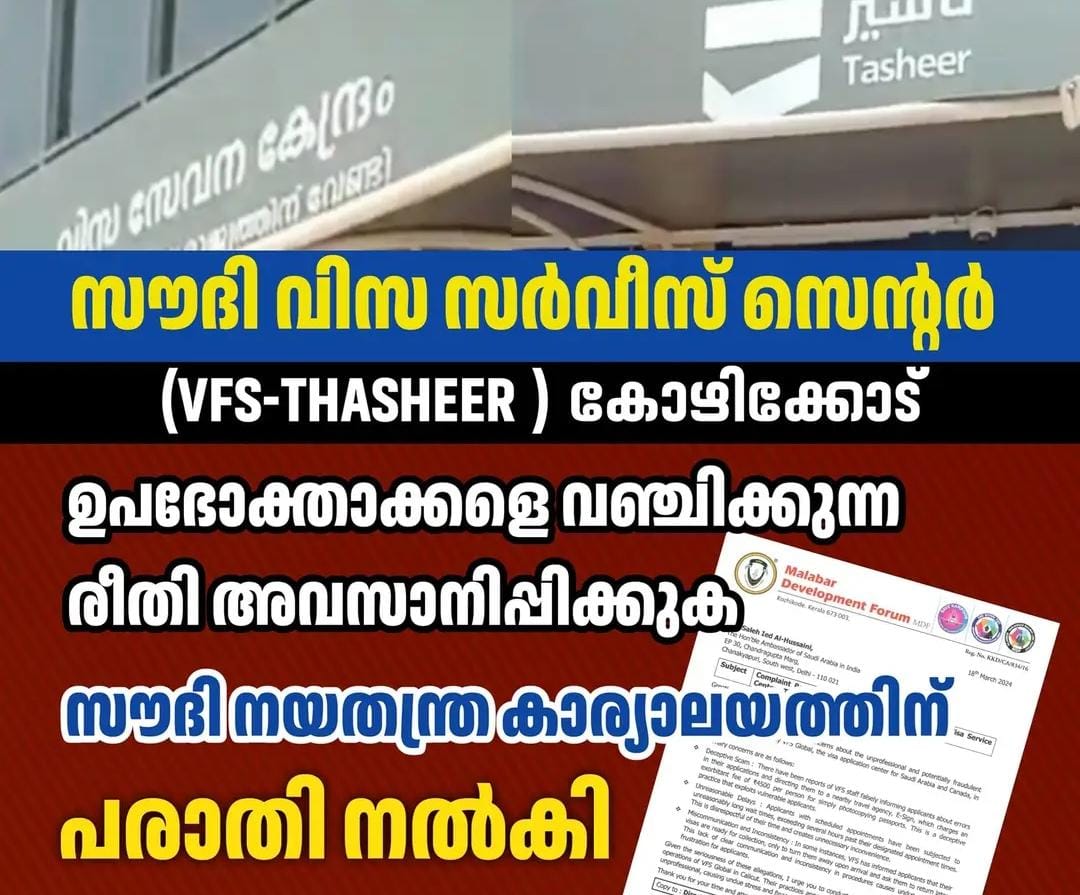 സഊദി അറേബ്യയി ലെ പ്രവാസികളുടെ ഭാര്യമാരേയും കുട്ടികളേയും ബന്ധുമിത്രാദികളെയും കൊള്ളയടിക്കുന്ന കോഴിക്കോട് ഹൈലൈറ്റ് മാളിന് അഭിമുഖമായുള്ള വി.എഫ്.എസ് (Thasheer Visa Service Centre) നെതിരായി ഇന്ത്യയിലെ ബഹുമാനപ്പെട്ട സഊദി അറേബ്യൻ അംബാസിഡറായ സാലെ ഈദ് അൽ ഹുസൈനി, റിയാദിലുള്ള തഷീർ വകുപ്പിൻ്റെ ഡയരക്ടർ എന്നിവർക്കാണ് പരാതി നൽകിയത്.