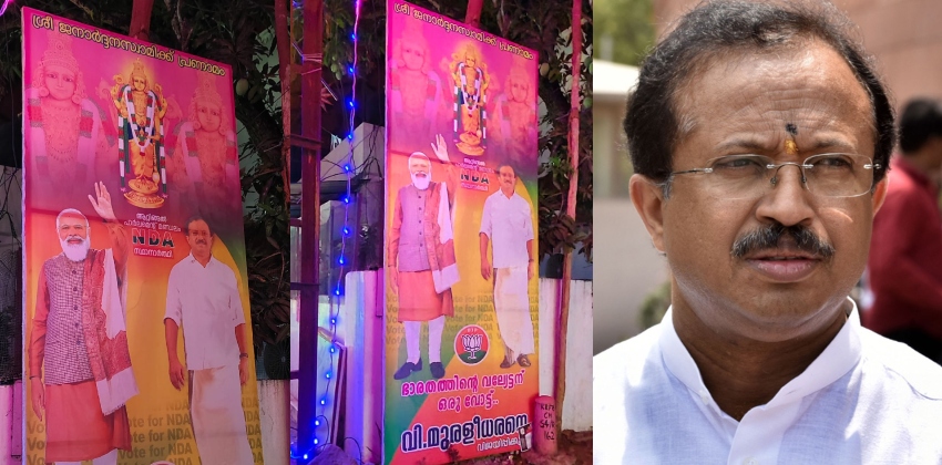 വർക്കലയിലാണ് വിഗ്രഹത്തിന്റെ ചിത്രം ഉപയോഗിച്ചുള്ള ഫ്ളക്സുകൾ വെച്ചത്. പ്രധാനമന്ത്രി നരേന്ദ്രമോദിയുടെയും സ്ഥാനാർഥിയുടെയും ചിത്രത്തോടൊപ്പം വിഗ്രഹത്തിന്റെ ചിത്രവും ഉപയോഗിക്കുകയായിരുന്നു. വി മുരളീധരന്റെ നടപടി ഗുരുതര ചട്ട ലംഘനമാണെന്നും പരാതിയിൽ പറഞ്ഞു.