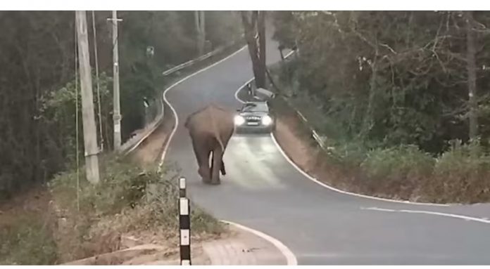 സ്വകാര്യ വ്യക്തികളുടെ സ്ഥലത്തേക്ക് കയറാൻ ശ്രമിച്ച ആനയെ വനത്തിലേക്ക് ഓടിക്കുന്നതിനിടെയാണ് കാർ എത്തിയത്. വനം വകുപ്പ് ഉദ്യോഗസ്ഥരും സംഭവസ്ഥലത്തുണ്ടായിരുന്നു. കാറിനെ നോക്കിയ ശേഷം പതിയെ ആന വനഭാഗത്തേക്ക് നടക്കുകയായിരുന്നു.