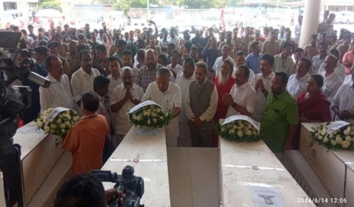 കൊച്ചി: കുവൈത്തിലെ തീപിടിത്തത്തില്‍ മരിച്ച 23 മലയാളികള്‍ക്ക് നാടിന്‍റെ അന്ത്യാഞ്ജലി. നെടുമ്പാശ്ശേരി വിമാനത്താവളത്തിന് പുറത്ത് പ്രത്യേകം സജ്ജമാക്കിയ സ്ഥലത്ത് 23 മൃതദേഹങ്ങളും പൊതുദര്‍ശനത്തിനുവെച്ചു. മുഖ്യമന്ത്രി പിണറായി വിജയനും മന്ത്രിമാരും റീത്ത് സമര്‍പ്പിച്ച് അന്തിമോപചാരമര്‍പ്പിച്ചു. തുടര്‍ന്ന് മരിച്ചവരുടെ കുടുംബാംഗങ്ങളും ബന്ധുക്കളും അന്തിമോപചാരമര്‍പ്പിച്ചു. പൊലീസിന്‍റെ ഔദ്യോഗിക ബഹുമതികളോടെയായിരുന്നു അന്തിമോപചാരം.