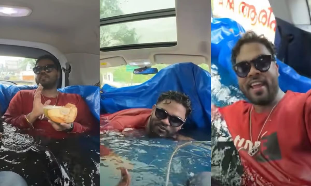 കാറിന് നടുവിലെ രണ്ട് സീറ്റുകള് മാറ്റി പകരം പ്ലാസ്റ്റിക് ടര്പോളിന് കൊണ്ട് സ്വിമ്മിംഗ് പൂള് തയ്യാറാക്കി. തുടര്ന്ന് മൂന്ന് സുഹൃത്തുക്കള്ക്കൊപ്പം അമ്പലപ്പുഴയിലെ റോഡിലൂടെ കാറിനുള്ളില് കുളിച്ചു കൊണ്ട് യാത്ര ചെയ്തു. ഇതിന്റെ ദൃശ്യങ്ങള് ട്യൂബില് പോസ്റ്റ് ചെയ്തു. യാത്രക്കിടെ ടര്പോളിന് ചോര്ച്ചയുണ്ടായി വെള്ളം കാറിനുള്ളില് പടര്ന്നു.