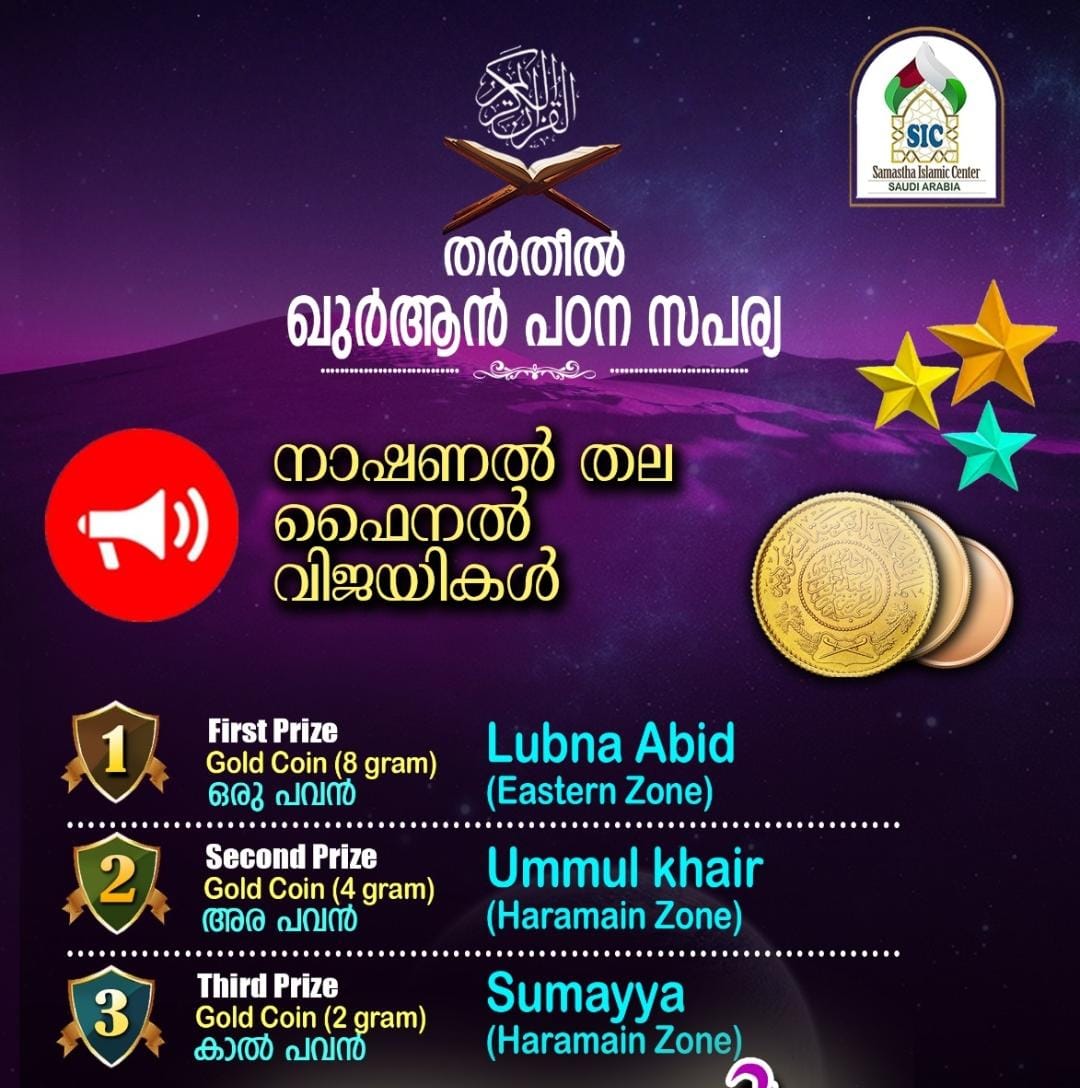 റിയാദ്: സമസ്ത ഇസ്ലാമിക് സെന്റർ നാഷണൽ കമ്മിറ്റി സംഘടിപ്പിച്ച ദ്വൈമാസ കാമ്പയിന്റെ ഭാഗമായി നടത്തിയ ‘തർതീൽ ഖുർആൻ പഠന സപര്യ’യുടെ മൂന്ന് ഘട്ടങ്ങളിലായി നടന്ന നാഷണൽ തല പരീക്ഷയുടെ വിജയികളെ പ്രഖ്യാപിച്ചു. ലുബ്ന ആബിദ് (ഈസ്റ്റേൺ സോൺ) ഒന്നാം സ്ഥാനം കരസ്ഥമാക്കി. ഉമ്മുൽ ഖൈർ (ഹറമൈൻ സോൺ) രണ്ടാം സ്ഥാനവും സുമയ്യ (ഹറമൈൻ സോൺ) മൂന്നാം സ്ഥാനവും കരസ്ഥമാക്കി.