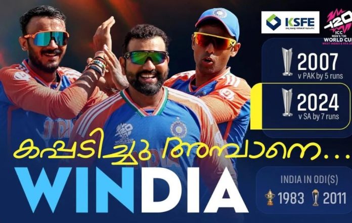 ബാർബഡോസ്: ഫൈനൽ പോരാട്ടത്തിൽ ദക്ഷിണാഫ്രിക്കയെ തോൽപിച്ച് ഇന്ത്യയ്ക്ക് ട്വന്റി20 ലോകകപ്പ് കിരീടം. ഇന്ത്യ ഉയർത്തിയ 177 റണ്‍സ് വിജയലക്ഷ്യം പിന്തുടർന്ന ദക്ഷിണാഫ്രിക്കയ്ക്ക് ഏഴു വിക്കറ്റ് നഷ്ടത്തിൽ 169 റൺസെടുക്കാനേ സാധിച്ചുള്ളൂ. ഇന്ത്യയ്ക്ക് ഏഴു വിക്കറ്റു വിജയം. ഹാർദിക് പാണ്ഡ്യയെറിഞ്ഞ അവസാന ഓവറിലെ ആദ്യ പന്തിൽ ഡേവിഡ് മില്ലര്‍ പുറത്തായതാണു കളിയിൽ നിർണായകമായത്. ബൗണ്ടറി ലൈനിനു സമീപത്തു നിൽക്കുകയായിരുന്ന സൂര്യകുമാർ യാദവ് തകർപ്പൻ ക്യാച്ചിലൂടെ മില്ലറെ പുറത്താക്കുകയായിരുന്നു.