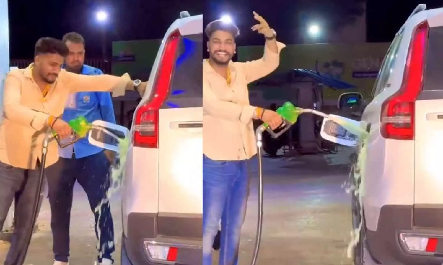 ഒരു പെട്രോൾ പമ്പിൽ നിന്ന്, എസ്.യുവിയിലേക്ക് ഇന്ധനം നിറക്കുന്നതാണ് വീഡിയോയിലുള്ളത്. ഫുള്‍ ടാങ്കായി പുറത്തേക് കളയുകയാണ് ഇയാള്‍. ഒടുവിൽ ക്യാമറക്ക് നേരെ ആഘോഷ ചിഹ്നം കാണിച്ചാണ് സാഹസം അവസാനിപ്പിക്കുന്നത്.