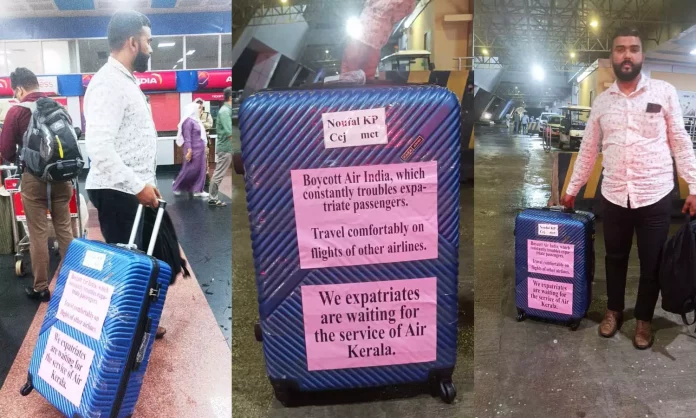 ‘പ്രവാസി യാത്രക്കാരെ നിരന്തരം ബുദ്ധിമുട്ടിക്കുന്ന എയര് ഇന്ത്യ ബഹിഷ്ക്കരിക്കുക, മറ്റ് കമ്പനികളുടെ വിമാനങ്ങളില് സുഖമായി യാത്ര ചെയ്യുക, എയര് കേരളയ്ക്കു വേണ്ടി ഞങ്ങള് പ്രവാസികള് കാത്തിരിക്കുന്നു’ എന്നെല്ലാം ലഗേജില് ഒട്ടിച്ച പോസ്റ്ററില് രേഖപ്പെടുത്തിയിരുന്നു.