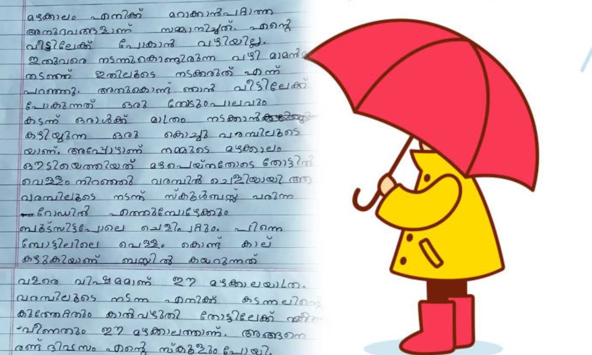 മഴക്കാലത്തെ കുറിച്ച് വിവരിക്കാൻ അധ്യാപിക ആവശ്യപ്പെട്ടപ്പോൾ സന്തോഷമായിരുന്നില്ല താൻ അനുഭവിക്കുന്ന ദുരിതമായിരുന്നു ആ കുഞ്ഞിന് പറയാനുണ്ടായിരുന്നത്. മന്ത്രിക്കും കലക്ടർക്കും പരാതി നൽകിയിട്ടും നട‌പ‌ടിയുണ്ടായില്ലെന്നാണ് കുഞ്ഞ് അയന വിഷമത്തോടെ കുറിക്കുന്നത്. കടന്നലിന്റെ കുത്തും തോട്ടിൽ വീണതും കാരണം രണ്ട് ദിവസം സ്കൂളിൽ പോകാൻ കഴിഞ്ഞില്ലെന്നതും അയന സങ്കടത്തോടെ പറയുന്നു. താൻ സ്കൂളിലേക്ക് പോയിരുന്ന വഴി ‘മാമൻമാർ’ കൊട്ടിയടച്ചതിനെ കുറിച്ചും അയന ഡയറിയിൽ കുറിച്ചിട്ടുണ്ട്.