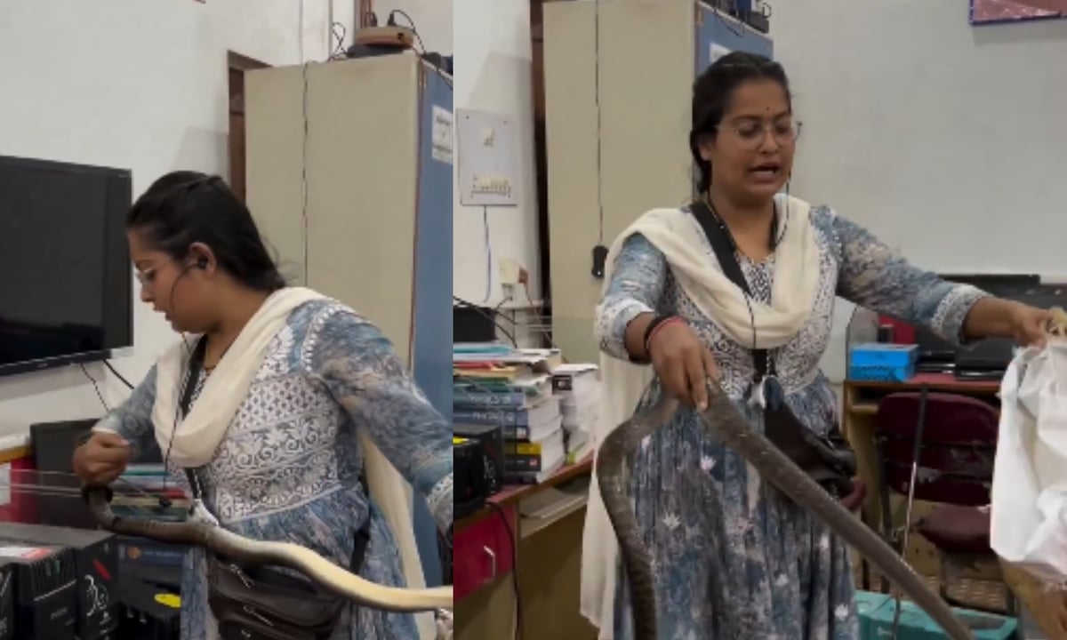മേശപ്പുറത്ത് പുസ്തകങ്ങളുടെയും ഫയലുകളുടെയും കൂമ്പാരത്തിന് പിന്നിലിരുന്ന പാമ്പിൻ്റെ അടുത്തേക്ക് അജിത പാണ്ഡെ പോകുന്നതും പതറാതെ പരിഭ്രാന്തിയും ഭയവുമില്ലാതെ പാമ്പിനെ കൈകൊണ്ട് പൊക്കിയെടുക്കുന്നതും വീഡിയോയിൽ കാണാം.