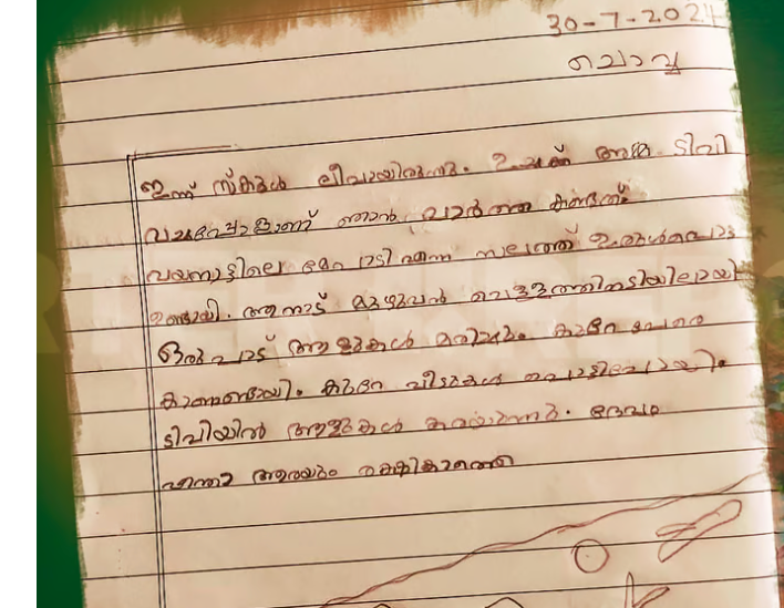 മനുഷ്യമനസ്സാക്ഷിയെ പിടിച്ചുകുലുക്കിയ ദുരന്തത്തിന്റെ ഉരുള്പൊട്ടല് ദുരന്ത ദുരന്തത്തിന്റെ പശ്ചാത്തലത്തില് ഹൃദയം തൊടുന്ന ഒരു ഡയറിക്കുറിപ്പ് എഴുതിയിരിക്കുകയാണ് കണ്ണൂര് ജില്ലയിലെ മുയ്യം എയുപി സ്കൂളിലെ രണ്ടാം ക്ലാസ് വിദ്യാര്ത്ഥിനി അദിതി. അദിതി എഴുതിയ ഡയറിക്കുറിപ്പിന്റെ ചിത്രം മുയ്യം സ്കൂളിന്റെ ഔദ്യോഗിക ഇന്സ്റ്റഗ്രാം പേജില് പങ്കുവെച്ചിട്ടുണ്ട്.