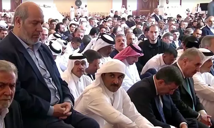 ശൈഖ് തമീം ബിന് ഹമദ് ആല്ഥാനിയും പിതാവ് അമീര് ശൈഖ് ഹമദ് ബിന് ഖലീഫ ആല്ഥാനിയും മയ്യിത്ത് നമസ്കാരത്തില് പങ്കെടുക്കുന്ന ദൃശ്യങ്ങള് പുറത്തുവന്നിട്ടുണ്ട്. വീല്ചെയറിലാണ് ശൈഖ് ഹമദ് ചടങ്ങിനെത്തിയത്. ഖത്തര് പ്രധാനമന്ത്രിയും വിശേദകാര്യ മന്ത്രിയുമായ ശൈഖ് മുഹമ്മദ് ബിന് അബ്ദുല് റഹ്മാന് ആല്ഥാനി, ഇറാന് വൈസ് പ്രസിഡന്റ് മുഹമ്മദ് റിസ ആരിഫ്, തുര്ക്കി വൈസ് പ്രസിഡന്റ് സിവ്ദെത് യില്മാസ്, വിദേശകാര്യ മന്ത്രി ഹകാന് ഫിദാന്, മലേഷ്യ ആഭ്യന്തര സഹമന്ത്രി ഷംസുല് അന്വാര്, ഇന്തോനേഷ്യ മുന് വൈസ് പ്രസിഡന്റ് യൂസുഫ് കല്ല, ഹമാസ് മുന് തലവന് ഖാലിദ് മിശ്അല് തുടങ്ങി പ്രമുഖരും മയ്യിത്ത് നമസ്കാരത്തില് പങ്കെടുത്തു.