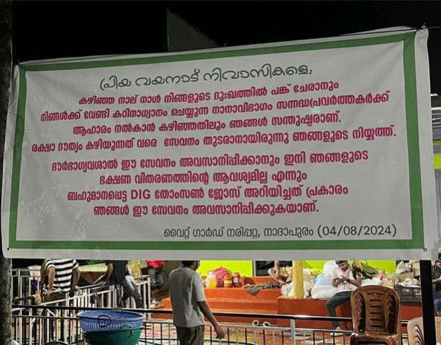 ‘പ്രിയ വയനാട് നിവാസികളെ, കഴിഞ്ഞ നാല് നാള്‍ നിങ്ങളുടെ ദുഃഖത്തില്‍ പങ്കുചേരാനും നിങ്ങള്‍ക്കുവേണ്ടി കഠിനാധ്വാനം ചെയ്യുന്ന നാനാവിഭാഗം സന്നദ്ധപ്രവര്‍ത്തകര്‍ക്ക് ആഹാരം നല്‍കാനും കഴിഞ്ഞതില്‍ ഞങ്ങള്‍ സന്തുഷ്ടരാണ്. രക്ഷാദൗത്യം കഴിയുന്നതുവരെ സേവനം തുടരാനായിരുന്നു ഞങ്ങളുടെ നിയ്യത്ത്. ദൗര്‍ഭാഗ്യവശാല്‍ ഈ സേവനം അവസാനിപ്പിക്കാനും ഇനി ഞങ്ങളുടെ ഭക്ഷണവിതരണത്തിന്റെ ആവശ്യമില്ല എന്നും ബഹുമാനപ്പെട്ട ഡി.ഐ.ജി തോംസണ്‍ ജോസ് അറിയിച്ചതുപ്രകാരം ഞങ്ങള്‍ ഈ സേവനം അവസാനിപ്പിക്കുകയാണ്’- വൈറ്റ്ഗാര്‍ഡ് പറയുന്നു.