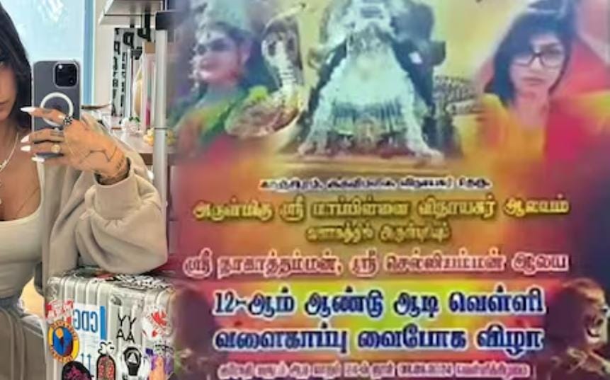 കാഞ്ചീപുരം: തമിഴ്നാട് കാഞ്ചീപുരത്ത് ക്ഷേത്ര ഉത്സവത്തിന്റെ ഭാഗമായി സ്ഥാപിച്ച പോസ്റ്ററിൽ മുൻ പോൺ താരം മിയാ ഖലീഫയുടെ ചിത്രവും. ‘ആടി പെരുക്ക്’ ഉത്സവത്തിന്റെ ഭാഗമായി സ്ഥാപിച്ച പോസ്റ്ററിലാണ് മിയ ഖലീഫയുടെ ചിത്രം ഉപയോഗിച്ചത്. പാൽ പാത്രം തലയിൽ വച്ചുകൊണ്ട് നടി നിൽക്കുന്നതായുള്ള ചിത്രമാണ് പോസ്റ്ററിൽ ഉണ്ടായിരുന്നത്.