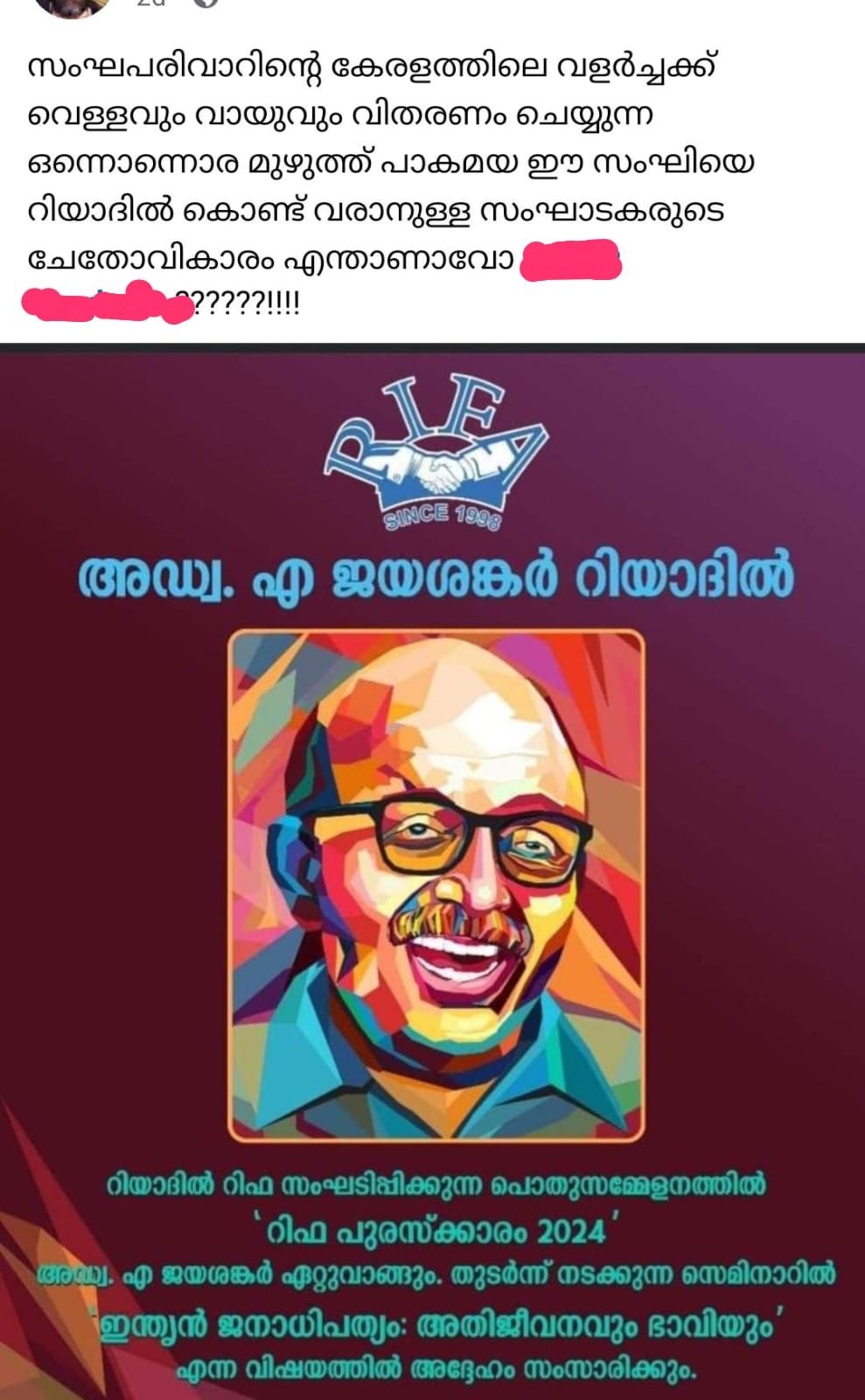 ഈ വര്ഷത്തെ റിഫ പുരസ്കാരത്തിന് അഡ്വ. ജയശങ്കറിനെ തിരഞ്ഞെടുത്ത വാർത്ത സംഘാടകര് പോസ്റ്റ് ഫേസ്ബുക്കില് പോസ്റ്റ് ചെയ്തതോടെയാണ് കടുത്ത സൈബര് ആക്രമണമുണ്ടായത്. സാമൂഹിക, സാംസ്കാരിക രംഗത്തെ ക്രിയാത്മക ഇടപെടലുകള് പരിഗണിച്ച് 50000 രൂപയും പ്രശസ്തി പത്രയും അടങ്ങുന്നതാണ് പുരസ്കാരം. ഗ്രന്ഥകര്ത്താവ്, നിരൂപകന്, മാധ്യമപ്രവര്ത്തകന് എന്നീ നിലകളില് വ്യക്തി മുദ്ര പതിപ്പിച്ച വ്യക്തിയാണ് ജയശങ്കര്.