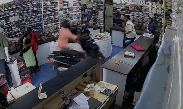 ഭർത്താവും കുഞ്ഞും വണ്ടിയിലിരിക്കെ ഭാര്യ കടയിലേക്ക് കയറി വസ്ത്രങ്ങൾ നോക്കുന്നതിനിടയിലാണ് സംഭവം. സ്കൂട്ടർ ഇടിച്ച് ഭാര്യ തലകുത്തി മറിഞ്ഞു. പരിക്ക് പറ്റിയ ഇവരെ ഹരിപ്പാട് താലൂക്ക് ആശുപത്രിയിൽ പ്രവേശിപ്പിച്ചു. അപകടത്തിൽ കടയിലെ സാധനങ്ങൾക്ക് കേടുപാടുകൾ സംഭവിച്ചിട്ടുണ്ട്. കായംകുളം സ്വദേശിയായ ഷെരീഫിന്റെ ഉടമസ്ഥതയിലുള്ളതാണ് കട.