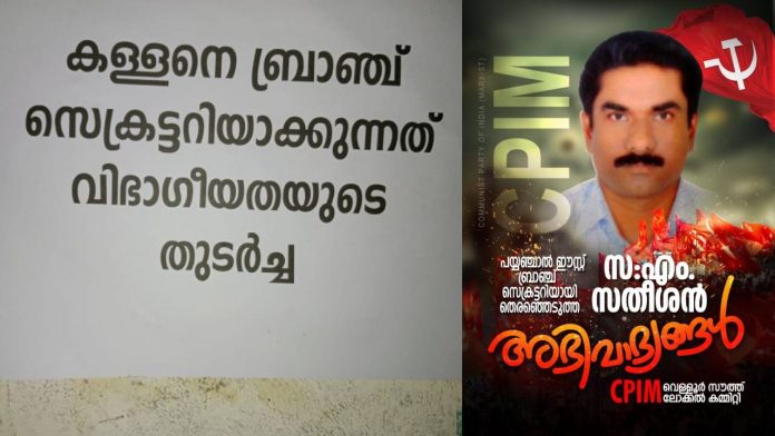 കള്ളനെ ബ്രാഞ്ച് സെക്രട്ടറിയാക്കുന്നത് വിഭാഗീയതയുടെ തുടർച്ച’; പയ്യന്നൂരിൽ എം. സതീശനെതിരെ പോസ്റ്റർ