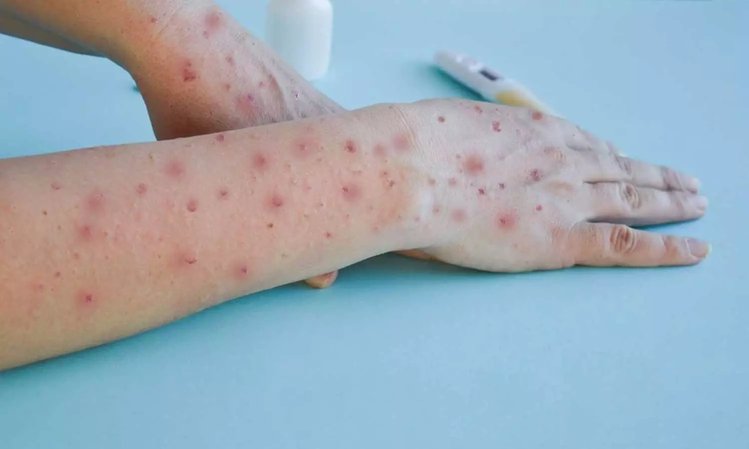 പനി, തീവ്രമായ തലവേദന, കഴലവീക്കം, നടുവേദന, പേശി വേദന, ഊര്ജക്കുറവ് എന്നിവയാണ് പ്രാരംഭ ലക്ഷണങ്ങള്. പനി തുടങ്ങി ഒരാഴ്ചയ്ക്കുള്ളില് ദേഹത്ത് കുമിളകളും ചുവന്ന പാടുകളും പ്രത്യക്ഷപ്പെടാന് തുടങ്ങും. മുഖത്തും കൈകാലുകളിലുമാണ് കൂടുതല് കുമിളകള് കാണപ്പെടുന്നത്. ഇതിനുപുറമെ കൈപ്പത്തി, ജനനേന്ദ്രിയം, കണ്ണുകള് എന്നീ ശരീരഭാഗങ്ങളിലും ഇവ കാണപ്പെടുന്നു.