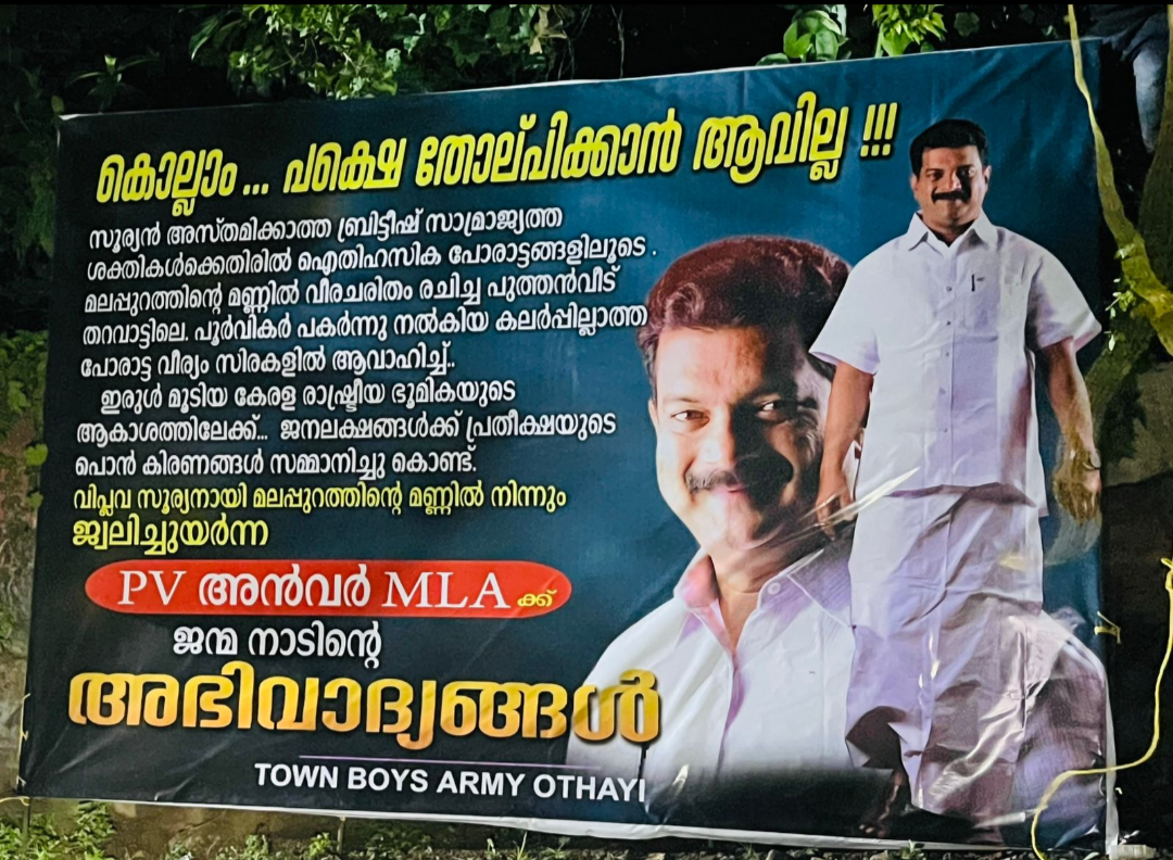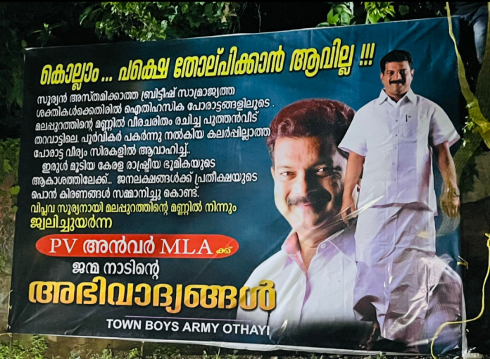 ഇരുള്‍ മൂടിയ കേരള രാഷ്ട്രീയ ഭൂമികയുടെ ആകാശത്തിലേക്ക്… ജനലക്ഷങ്ങള്‍ക്ക് പ്രതീക്ഷയുടെ പൊൻ കിരണങ്ങള്‍ സമ്മാനിച്ചുകൊണ്ട് വിപ്ലവ സൂര്യനായി മലപ്പുറത്തിന്‍റെ മണ്ണിൽ നിന്ന് ജ്വലിച്ചുയര്‍ന്ന പിവി അൻവര്‍ എംഎല്‍എയ്ക്ക് ജന്മനാടിന്‍റെ അഭിവാദ്യങ്ങള്‍’