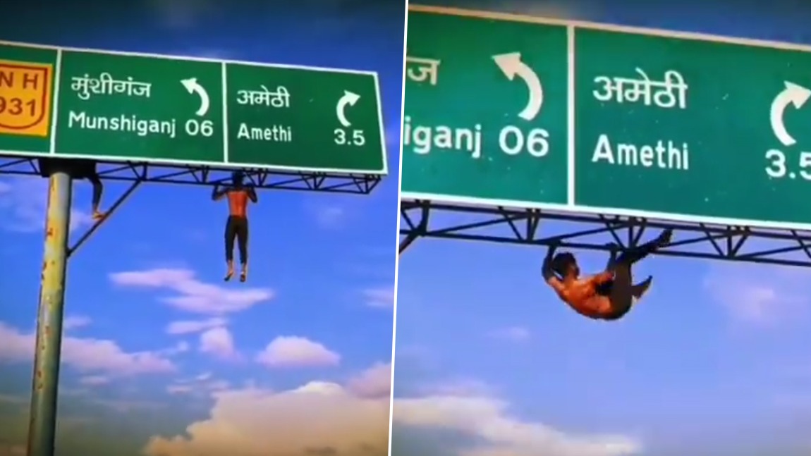 ഉത്തർപ്രദേശിലെ നാഷണൽ ഹൈവേ 931ൽ ചിത്രീകരിച്ച വീഡിയോയിൽ, ഒരു യുവാവ് തൻ്റെ മസിലുകൾ പ്രദർശിപ്പിച്ച് സൈൻ ബോർഡിൽ പുൾ അപ്പ് എടുക്കുന്നതായി കാണാം. റോഡിൽ നിന്ന് ഏകദേശം 10 മീറ്റർ ഉയരത്തിലുള്ള ബോർഡിൽ നിന്നാണ് ഈ അഭ്യാസ പ്രകടനം. സൈൻ ബോർഡിൻ്റെ ഒരു വശത്ത് മറ്റൊരാൾ ഇരിക്കുന്നതായും കാണാം.