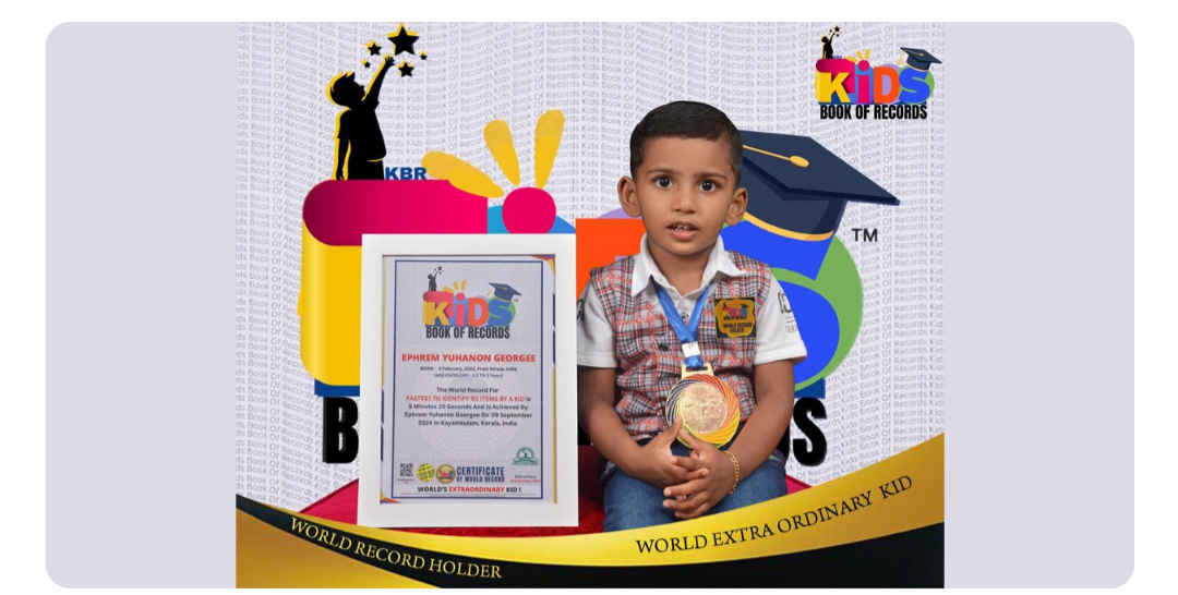 അഞ്ച് മിനിറ്റ് 20 സെക്കന്ഡില് 90 ഇനങ്ങള് തിരിച്ചറിഞ്ഞ് കിഡ്സ് ബുക്ക് ഓഫ് റെക്കോര്ഡ്സില് ലോക റെക്കോര്ഡും കരസ്ഥമാക്കി ഈ കൊച്ചു മിടുക്കന്. മസ്കത്ത് മര്ത്തശ്മുനി യാക്കോബായ സുറിയാനി പള്ളി വികാരി ഫാ. ജോര്ജി ജോണ് കട്ടച്ചിറയുടെയും മേഘാ തങ്കച്ചന്റെയും മകനാണ് എഫ്രേം.