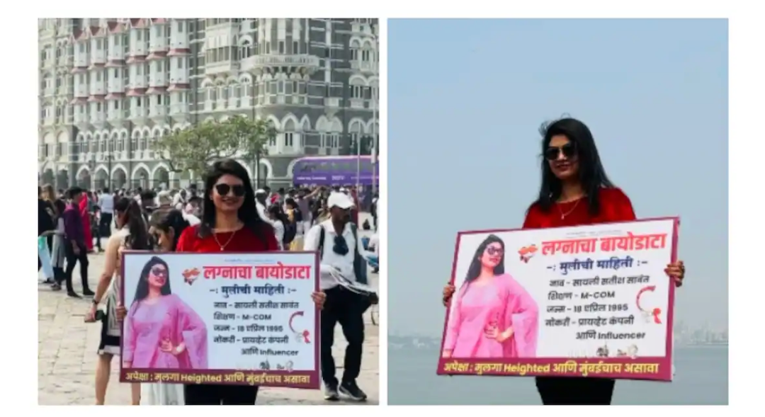 വിചിത്രമായ ഒരു വിവാഹ പരസ്യം സമൂഹ മാധ്യമങ്ങളുടെ ശ്രദ്ധ നേടി. മുംബൈയിലെ ലോക പ്രശസ്തമായ താജ് ഹോട്ടലിന് മുന്നില്‍ തന്‍റെ വിവാഹ ബയോഡാറ്റ പതിച്ച പ്ലേക്കാര്‍ഡുമായി നിന്ന ഒരു യുവതിയുടെ വീഡിയോയാണ് സമൂഹ മാധ്യമങ്ങളില്‍ ഒരേസമയം ചിരിയും അമ്പരപ്പും സൃഷ്ടിച്ചത്.