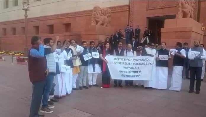 വയനാടിന് നീതി തേടി കേരള എംപിമാര്‍; പാർലമെന്‍റ് വളപ്പിൽ പ്രതിഷേധം