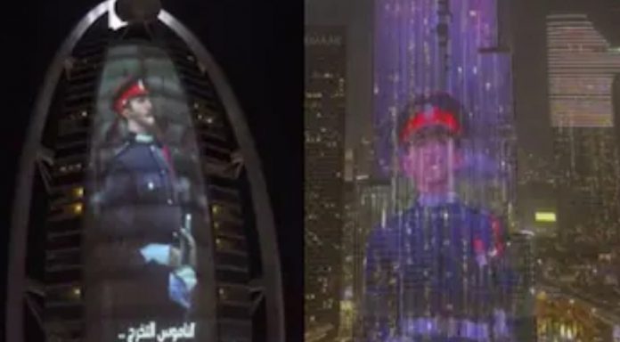 യുഎഇ വൈസ് പ്രസിഡന്റും പ്രധാനമന്ത്രിയും ദുബൈ ഭരണാധികാരിയുമായ ശൈഖ് മുഹമ്മദ് ബിന് റാഷിദ് അല് മക്തൂമിന്റെ ചെറുമകനായ ശൈഖ് മുഹമ്മദ് ബിന് റാഷിദ് ബിന് മുഹമ്മദ് ബിന് റാഷിദ് അല് മക്തൂമിന്റെ ചിത്രമാണ് ദുബൈയിലെ പ്രധാനപ്പെട്ട കെട്ടിടങ്ങളായ ബുര്ജ് ഖലീഫയിലും ബുര്ജ് അല് അറബിലും തെളിഞ്ഞത്. യുകെയിലെ റോയല് മിലിറ്ററി അക്കാദമി സാന്ഡ്ഹസ്റ്റില് നിന്ന് ബിരുദം കരസ്ഥമാക്കിയ രാജകുടുംബത്തിലെ ഇളമുറക്കാരനായ ശൈഖ് മുഹമ്മദ് ബിന് റാഷിദ് ബിന് മുഹമ്മദിന് അഭിനന്ദനം അറിയിച്ചുകൊണ്ടാണ് ചിത്രം തെളിഞ്ഞത്.