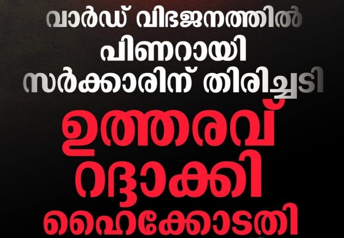 കൊച്ചി: സർക്കാർ പുറപ്പെടുവിച്ച വാർഡ് വിഭജന ഉത്തരവ് റദ്ദാക്കി ഹൈക്കോടതി. എട്ട് നഗരസഭകളിലെയും ഒരു പഞ്ചായത്തിലെയും വാർഡ് വിഭജനമാണ് കോടതി റദ്ദാക്കിയിരിക്കുന്നത്. തദ്ദേശ തിരഞ്ഞെടുപ്പിന് മുന്നോടിയായി വിവിധയിടങ്ങളിൽ വാർഡ് വിഭജനം പൂർത്തിയാക്കി വരികയാണ് സർക്കാർ. ഇതിനിടെയാണ് തിരിച്ചടി ഉണ്ടായിരിക്കുന്നത്.