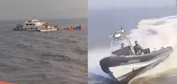 മുംബൈ: ഗേറ്റ് വേ ഓഫ് ഇന്ത്യക്ക് സമീപം മുംബൈ തീരത്ത് യാത്രാ ബോട്ടും നാവികസേനയുടെ സ്പീഡ് ബോട്ടും കൂട്ടിയിടിച്ചുണ്ടായ അപകടത്തിന്റെ ദൃശ്യങ്ങള് പുറത്തുവന്നു. സ്പീഡ് ബോട്ടിടിച്ച് തകര്ന്ന യാത്ര ബോട്ടില് നുറിലധികം പേരുണ്ടായിരുന്നു. ഇതില് 13 പേര് മരിച്ചതായി മഹാരാഷ്ട്ര മുഖ്യമന്ത്രി ദേവേന്ദ്ര ഫഡ്നവിസ് അറിയിച്ചു. 101 പേരെ രക്ഷപ്പെടുത്തിയതായും മഹാരാഷ്ട്ര മുഖ്യമന്ത്രി അറിയിച്ചു. രക്ഷപ്പെട്ടവരില് ചിലര് അതീവഗുരുതരാവസ്ഥയിലാണെന്നാണ് വിവരം.