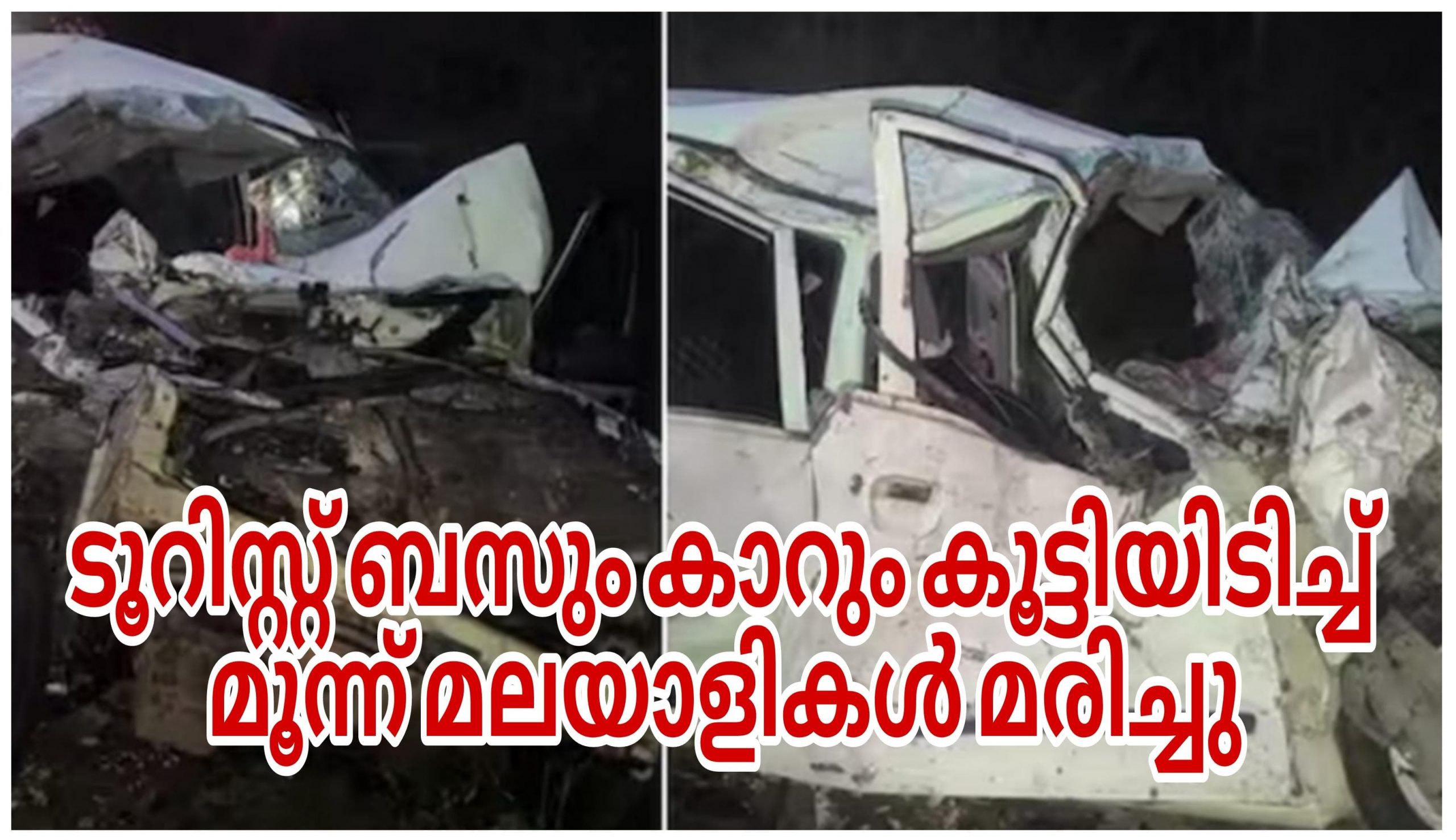 ഇടിയുടെ ആഘാത ത്തിൽ കാര് പൂര്ണമായി തകര്ന്നു, ബസ് റോഡില് തലകീഴായി മറിഞ്ഞു