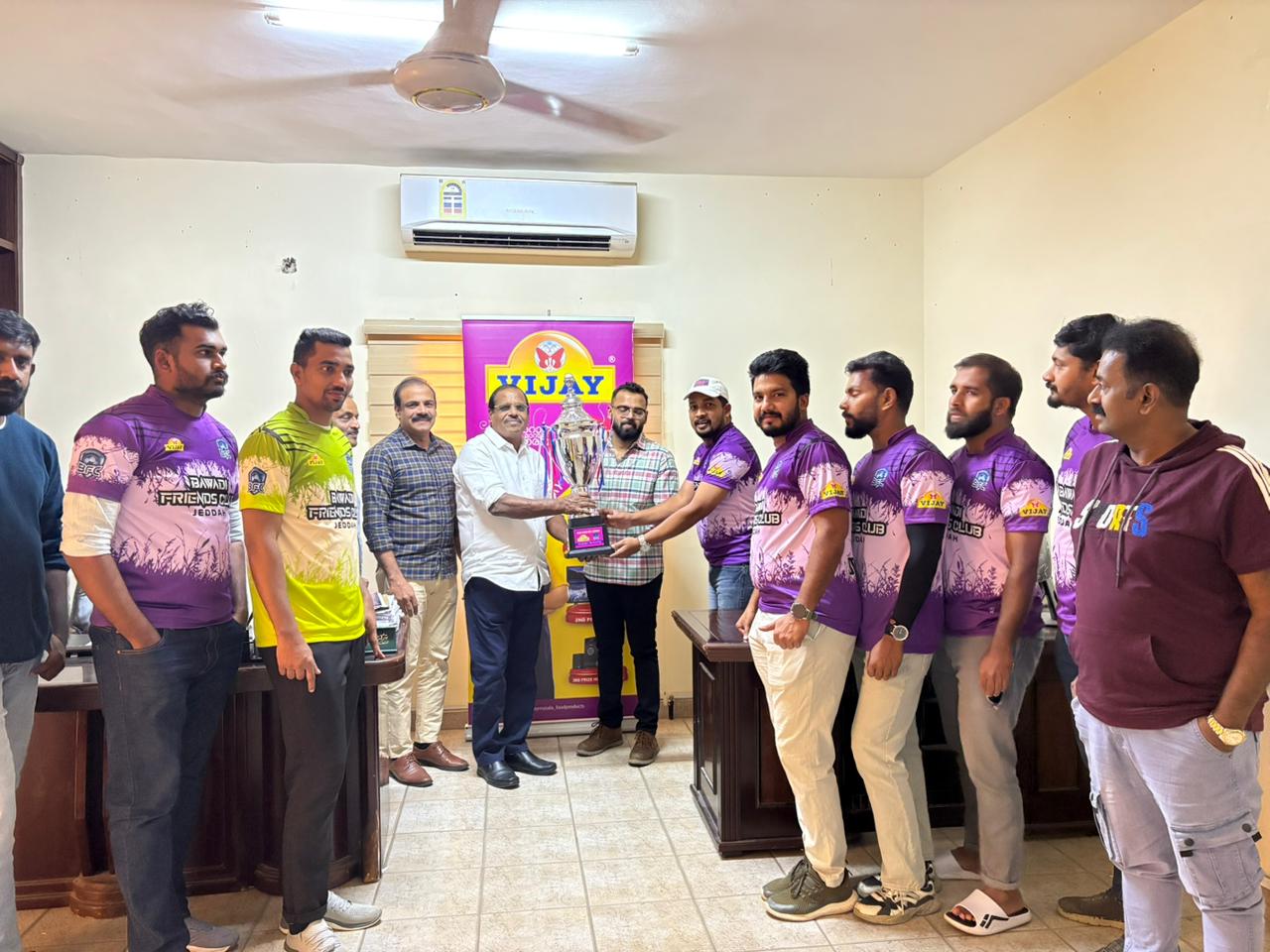 ഞായറാഴ്ച ജിദ്ദയിലെ അൽ ഹംറയിലുള്ള വിജയ് ഫൂ ഓഫീസിൽ വെച്ച് നടന്ന കപ്പ് ഹാൻഡ്ഓവർ സെറിമണിയുടെ വേളയിൽ വിജയ് ഫൂഡ് കമ്പനി ഓണർമാരായ ജോസ് മൂലൻ, ജോയ് മൂലൻ, പ്രവീൺ മൂലൻ എന്നിവർക്ക് ക്ലബ് മാനേജർ ശിഹാബ് പൊറ്റമ്മൽ, ഭാരവാഹികളായ നിഷാദ്, അനസ്, അഹമ്മദ്, ജസീൽ, ക്യാപ്റ്റൻ ഫസൽ എന്നിവർ ചേർന്ന് കപ്പ് കൈമാറി. ചടങ്ങിൽ വിജയ് ഫുഡ് കമ്പനി ജിദ്ദ റീജിയൻ സൂപ്പർവൈസർ മുസ്തഫ മൂപ്ര കമ്പനി സാരഥികളായ സുശീലൻ, അനിൽ കുമാർ എന്നിവർ ക്ലബ് ഭാരവാഹികളെയും ടീമിനെയും അഭിനന്ദിച്ചു.