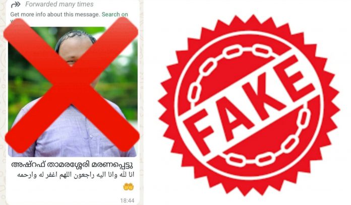 ദുബൈ: പ്രവാസ ലോകത്തെ പ്രമുഖ സാമൂഹ്യ പ്രവർത്തകൻ അഷ്റഫ് താമരശ്ശേരി അന്തരിച്ചതായി വ്യാജ വാർത്ത. ഞായറാഴ്ച വൈകീട്ടടെയാണ് സാമൂഹിക മാധ്യമങ്ങളിൽ വാർത്ത പ്രചരിച്ചത്. വാർത്ത കണ്ടവർ ഞെട്ടലോടെ ഷെയർ ചെയ്യുകയും ചെയ്തതോടെ ചുരുങ്ങിയ സമയുങ്ങൾക്കുള്ളിൽ മരണ വാർത്ത ഏറെ ഷെയർ ചെയ്യപ്പെട്ടു. വാർത്ത വന്നതോടെ അഷ്റഫ് താമരശ്ശേരി ഫെസ്ബുക്ക് ലൈവിൽ വന്ന് വീഡിയോ ചെയ്തു. വീഡിയോ കാണാം👇