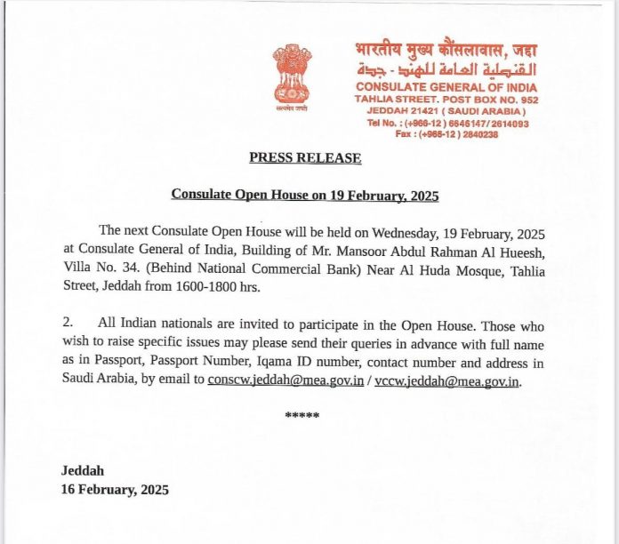 ഫെബ്രുവരി 19 ബുധനാഴ്ച വൈകുന്നേരം വൈകിട്ട് നാലു മുതൽ രാത്രി എട്ടു മണിവരെ ജിദ്ദയിലെ ഇന്ത്യൻ കോൺസുലേറ്റിൽ നടക്കുന്ന ഓപ്പൺ ഫോറത്തിൽ ഇന്ത്യൻ പ്രവാസികൾ നേരിടുന്ന പ്രശ്നങ്ങൾ അവതരിപ്പിക്കാൻ സൗകര്യമുണ്ടാകും. ഇങ്ങനെ പരാതി നൽകാൻ ഉദ്ദേശിക്കുന്നവർ പാസ്പോർട്ട് കോപ്പി, പാസ്പോർട്ട് നമ്പർ, കോണ്ടാക്ട് നമ്പർ, സൗദിയിലെ വിലാസം എന്നിവ സഹിതം conscw.jeddah@mea.gov.in, vccw.jeddah@mea.gov.in എന്ന ഇമെയിൽ വിലാസത്തിൽ മുൻകൂട്ടി പരാതി അയക്കണം.