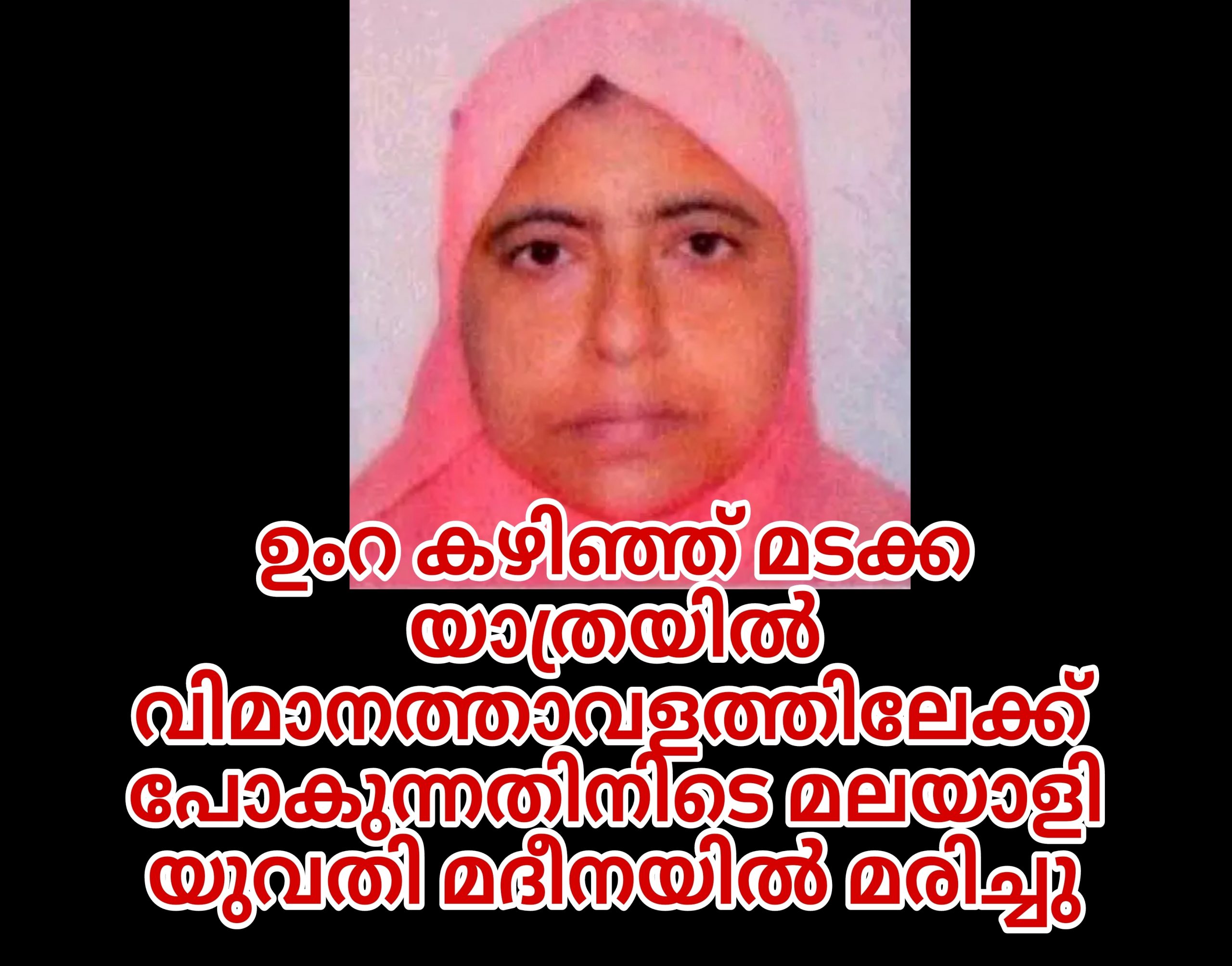 മദീന: മലയാളി ഉംറ തീർഥാടക മദീന സന്ദർശനം പൂർത്തിയാക്കി വിമാനത്താവളത്തിലേക്കുള്ള യാത്രാമധ്യേ നിര്യാതയായി. മലപ്പുറം ഉള്ളണം അട്ടക്കുഴിങ്ങര അമ്മാംവീട്ടിൽ മൂസ ഹാജിയുടെ മകൾ ഉമ്മു സൽമയാണ് (49) മരിച്ചത്. മൂന്നിയൂർ കളിയാട്ടുമുക്കിൽ മരക്കടവൻ മുസ്തഫയുടെ ഭാര്യയാണ്. ഫെബ്രുവരി 19നാണ് സ്വകാര്യ ഉംറ ഗ്രൂപ്പിൽ ജിദ്ദയിലെത്തിയത്.