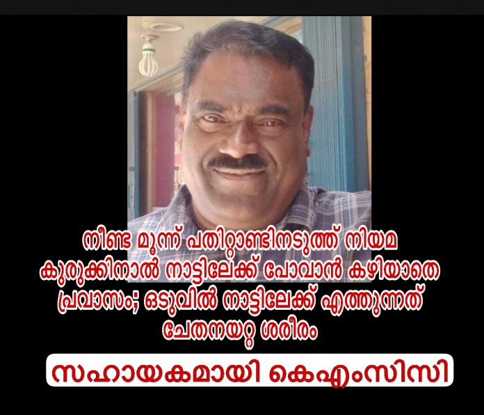 റിയാദ്: നീണ്ട മൂന്ന് പതിറ്റാണ്ടിനടുത്ത് നിയമ കുരുക്കിനാൽ നാട്ടിലേക്ക് പോവാൻ കഴിയാതെ നിന്നിരുന്ന മലപ്പുറം സ്വദേശിയുടെ മടക്കം ഒടുവിൽ ചേതനയറ്റ ശരീരവുമായി. 1997 സെപ്തബറിൽ മുംബൈയിൽ നിന്നു വിമാനമാർഗ്ഗം സഊദിയിൽ എത്തിയ മലപ്പുറം പുൽപെറ്റ തൃപ്പനച്ചി പാലക്കാട്ടെ കൈത്തൊട്ടിൽ ഹരിദാസിന്റെ കഥയാണ് ഏറെ ദുരിതം നിറഞ്ഞത്. നിയമക്കുരുക്കുകളിൽ പെട്ട് ജീവിതം പ്രവാസ ലോകത്ത് തന്നെ ഒടുങ്ങിയപ്പോൾ കെഎംസിസി പ്രവർത്തകരുടെ സഹായത്തോടെയാണ് മൃതദേഹം നാട്ടിലേക്ക് അയക്കുന്നത്.