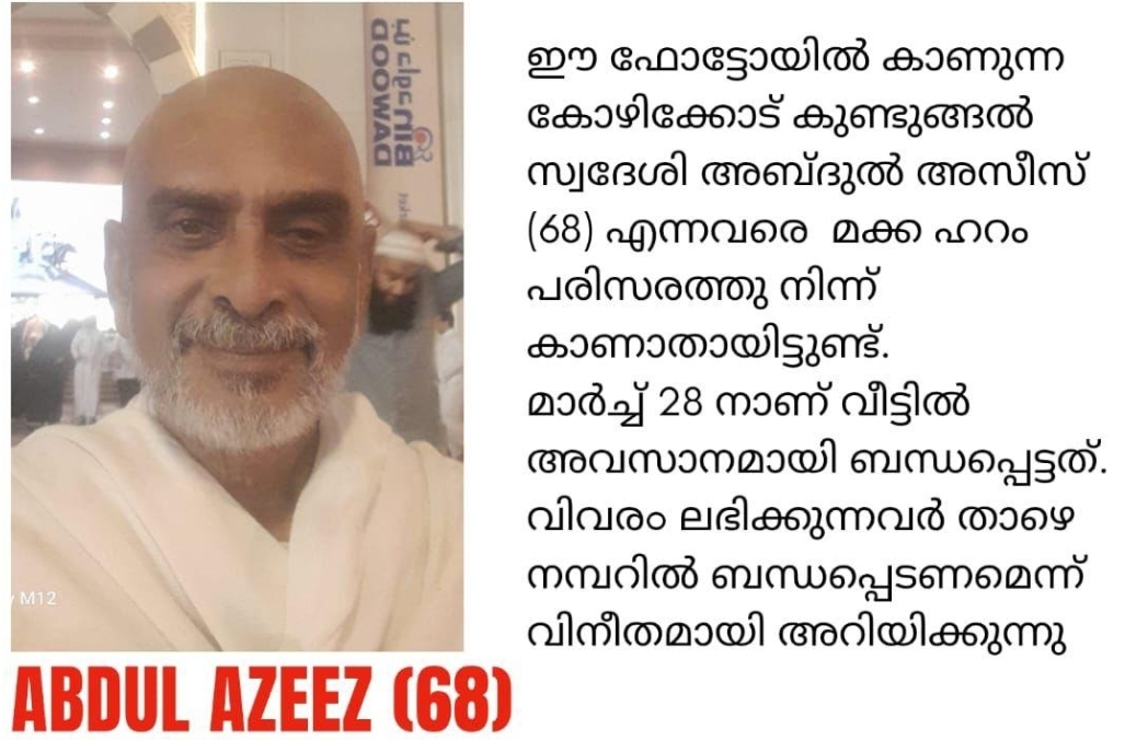 ഉംറക്കെത്തിയ കോഴിക്കോട് സ്വദേശിയെ മക്കയിൽ കാണാതായി; കണ്ടെത്താൻ സഹായം അഭ്യർത്ഥിച്ച് കുടുംബം