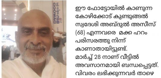 ഉംറക്കെത്തിയ കോഴിക്കോട് സ്വദേശിയെ മക്കയിൽ കാണാതായി; കണ്ടെത്താൻ സഹായം അഭ്യർത്ഥിച്ച് കുടുംബം