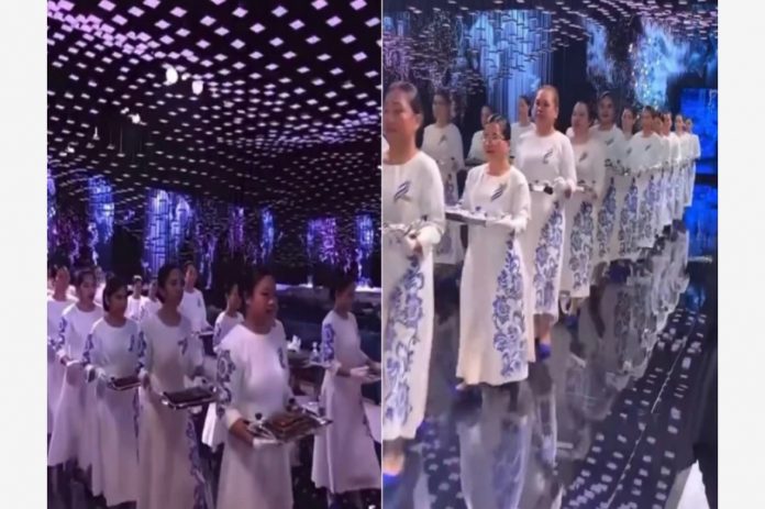 രാജകീയ വിവാഹ പരിപാടികളിൽ പങ്കെടുക്കുന്നവരുടെ മേശകളിൽ വിതരണം ചെയ്യുന്നതിനായി വിവിധ പ്ലേറ്റുകളിൽ മധുരപലഹാരങ്ങളുമായി ഡസൻ കണക്കിന് ഏഷ്യൻ സ്ത്രീകൾ വരിവരിയായി ഹാളിലേക്ക് പ്രവേശിക്കുന്നത് വീഡിയോയിൽ കാണിച്ചു.
