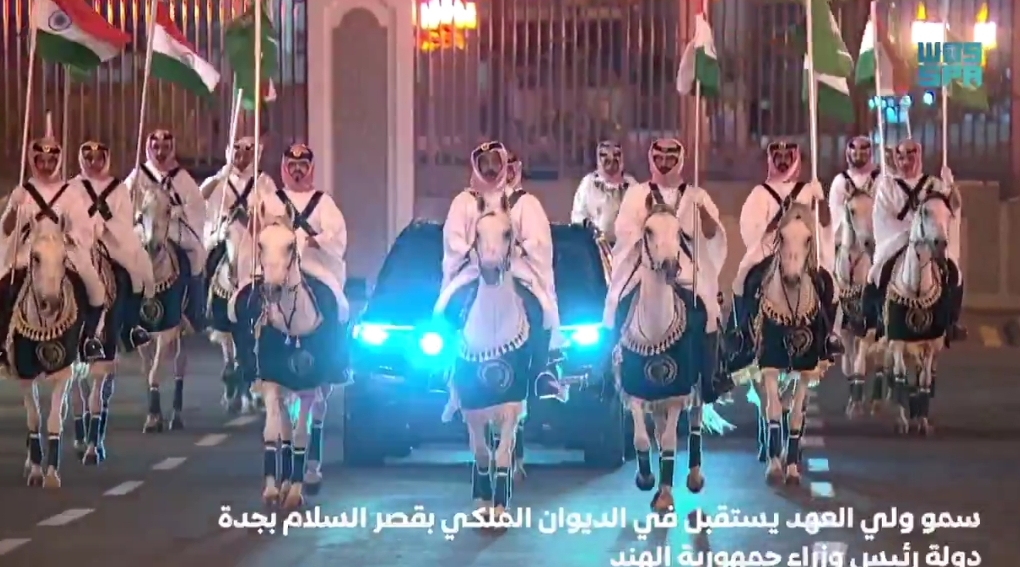 സഊദിയുടെ ആകാശത്ത് അകമ്പടിയായി റോയൽ എയർഫോഴ്സ് യുദ്ധവിമാനങ്ങൾ, രാജ കൊട്ടാരത്തിൽ കുതിരകളുടെ അകമ്പടി; പ്രധാനമന്ത്രിക്ക് ജിദ്ദയിൽ ലഭിച്ചത് രാജകീയ വരവേൽപ്പ് – വീഡിയോ