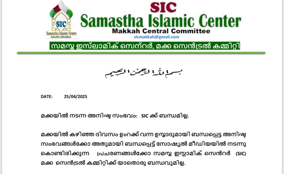 മക്ക- കഴിഞ്ഞ ദിവസം ഉംറക്ക് വന്ന ഉസ്താദുമായി ബന്ധപ്പെട്ട അനിഷ്ട സംഭവങ്ങൾക്കോ അതുമായി ബന്ധപ്പെട്ട് സോഷ്യൽ മീഡിയയിൽ പ്രചരിച്ചു കൊണ്ടിരിക്കുന്ന പ്രചരണങ്ങൾക്കോ സമസ്ത ഇസ്ലാമിക് സെൻറർ (SIC) മക്ക സെൻട്രൽ കമ്മിറ്റിക്ക് യാതൊരു ബന്ധവുമില്ല.