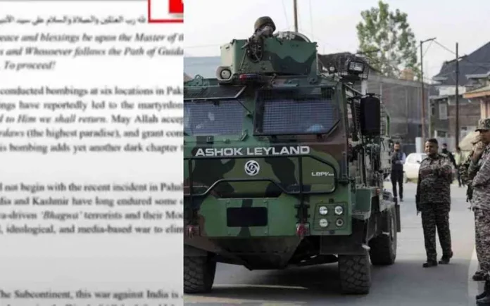 ഇന്ത്യക്കെതിരായ യുദ്ധത്തിൽ ഒന്നിക്കണമെന്നും പ്രസ്താവനയിൽ പറയുന്നു. ‘ഭഗവ’ ഭരണകൂടം എന്നാണ് ഇന്ത്യയിലെ സർക്കാരിനെ പ്രസ്താവനയിൽ വിശേഷിപ്പിക്കുന്നത്. പാകിസ്താൻ മണ്ണിൽ ഇന്ത്യൻ ആക്രമണം എന്ന തലക്കെട്ടോടെയാണ് ഇത് പ്രചരിക്കുന്നത്.