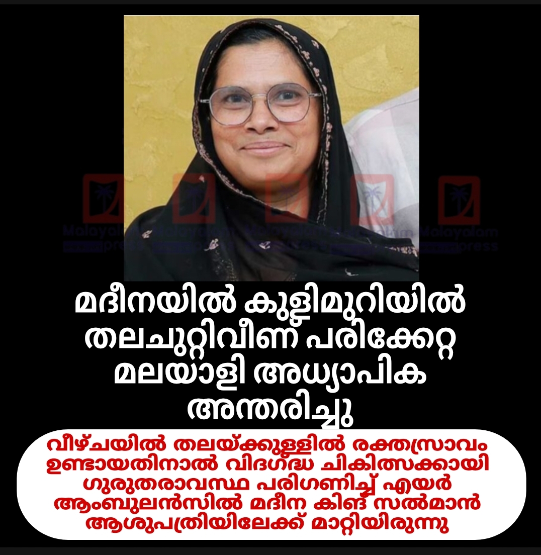 മദീന: കുളിമുറിയിൽ തലചുറ്റിവീണ് പരുക്കേറ്റതിനെ തുടർന്ന് ചികിത്സയിലായിരുന്ന മലയാളി അധ്യാപിക മദീനയിൽ അന്തരിച്ചു. കോട്ടയം തൃക്കൊടിത്താനം സ്വദേശി പുതുപ്പറമ്പിൽ റെജീന ഷെറീഫ് (58) ആണ് മരിച്ചത്. തബൂക്കിലെ സ്വകാര്യ സ്കൂളിൽ അധ്യാപികയായിരുന്നു ഇവർ. രക്തസമ്മർദ്ദം മൂലം കുളിമുറിയിൽ തലചുറ്റി വീണ് പരുക്കേറ്റതിനെ തുടർന്ന് റെജീന തബൂക്ക് കിങ് ഫഹദ് ആശുപത്രിയിൽ ചികിത്സ തേടിയിരുന്നു.