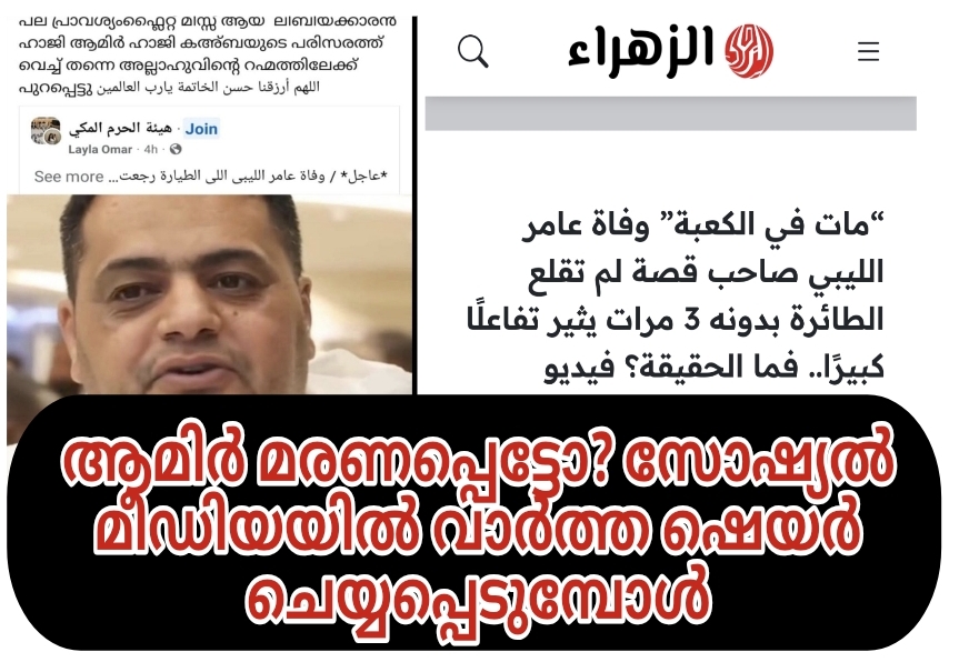 എന്നാൽ, ഇപ്പോൾ ഇദ്ദേഹം മരണപെട്ടു എന്ന വാർത്തയാണ് സോഷ്യൽ മീഡിയയിൽ പലരും പങ്ക് വെക്കുന്നത്. കഴിഞ്ഞ കുറച്ച് മണിക്കൂറുകളായി, കഅബയ്ക്ക് ചുറ്റും ത്വവാഫ് ചെയ്യുന്നതിനിടെ ആമിർ അൽ-ലിബി മരിച്ചുവെന്ന് സൂചിപ്പിക്കുന്ന ചില വാർത്തകൾ സോഷ്യൽ മീഡിയയിൽ പ്രചരിക്കുന്നുണ്ട്. എന്നിരുന്നാലും, ഈ വാർത്ത ഇതുവരെ സ്ഥിരീകരിച്ചിട്ടില്ല, അതായത് ഇത് ഇപ്പോഴും ഒരു കിംവദന്തി മാത്രമാണെന്നാണ് മനസിലാകുന്നത്. ഞങ്ങളുടെ അന്വേഷണത്തിൽ വാസ്തവത്തിൽ യാതൊരു അടിസ്ഥാനവുമില്ലെന്നാണ് അറിയാൻ കഴിഞ്ഞത്. ഫെസ്ബുക്ക് പോലെയുള്ള സോഷ്യൽ മീഡിയകളിൽ കാണുന്ന ഔദ്യോഗിക പേരിലുള്ള വ്യാജ ലിങ്കുകളിൽ ഉള്ള കാര്യങ്ങളാണ് മലയാളികൾ ഉൾപ്പെടെ ഷെയർ ചെയ്യപ്പെടുന്നത്.