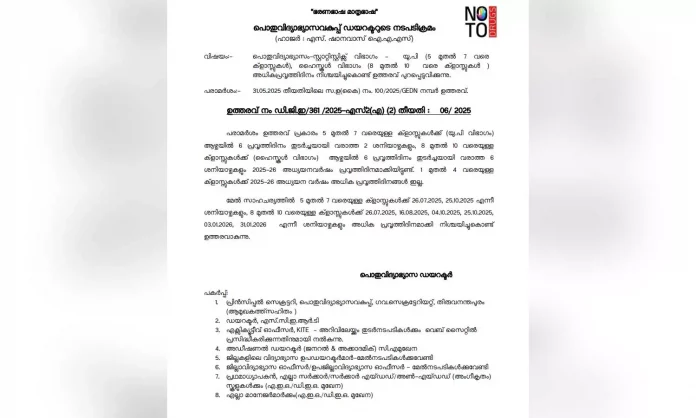രാവിലെയും വൈകിട്ടുമായി അരമണിക്കൂർ അധിക അധ്യായനം നടത്തും. എട്ട് പിരീഡ് നിലനിർത്തിയാണ് സമയക്രമീകരണം നടത്തിയിരിക്കുന്നത്. അഞ്ചു മുതൽ ഏഴ് വരെയുള്ള ക്ലാസുകൾക്ക് ആഴ്ചയിൽ ആറു പ്രവൃത്തിദിനം തുടർച്ചയായി വരാത്ത രണ്ട് ശനിയാഴ്ചകളും എട്ട് മുതൽ പത്തു വരെയുള്ള ക്ലാസുകൾക്ക് ആഴ്ചയിൽ റു പ്രവൃത്തി ദിനം തുടർച്ചയായി വരാത്ത ആറു ശനിയാഴ്ചകളും പ്രവൃത്തി ദിനമാക്കിയിട്ടുണ്ട്. ഒന്നു മുതൽ നാലു വരെയുള്ള ക്ലാസുകൾക്ക് അധിക പ്രവൃത്തി ദിനങ്ങളില്ല.