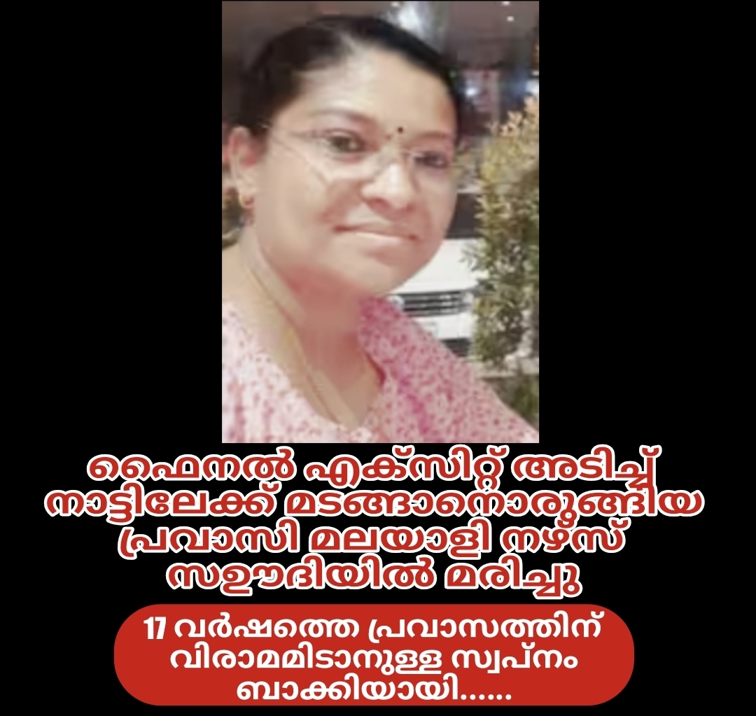 റിയാദ്: സൗദിയിലെ ജോലിയവസാനിപ്പിച്ച് നാട്ടിലേക്ക് മടങ്ങാനിരുന്ന മലയാളി നഴ്സ് മരിച്ചു. തെക്കുപടിഞ്ഞാറൻ പ്രവിശ്യയായ ജീസാന് സമീപം ദർബിൽ കോട്ടയം സ്വദേശിനി അനുഷ്മ സന്തോഷ് കുമാർ (42) ആണ് മരിച്ചത്. ഷുഖൈഖ് പ്രൈമറി ഹെൽത്ത് സെൻററിൽ സ്റ്റാഫ് നഴ്സായിരുന്നു. ദർബ് ജനറൽ ആശുപത്രിയിൽ വെച്ചാണ് മരിച്ചത്.