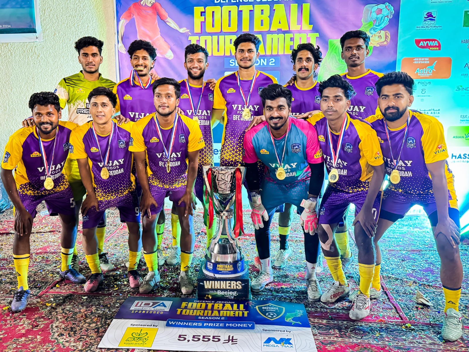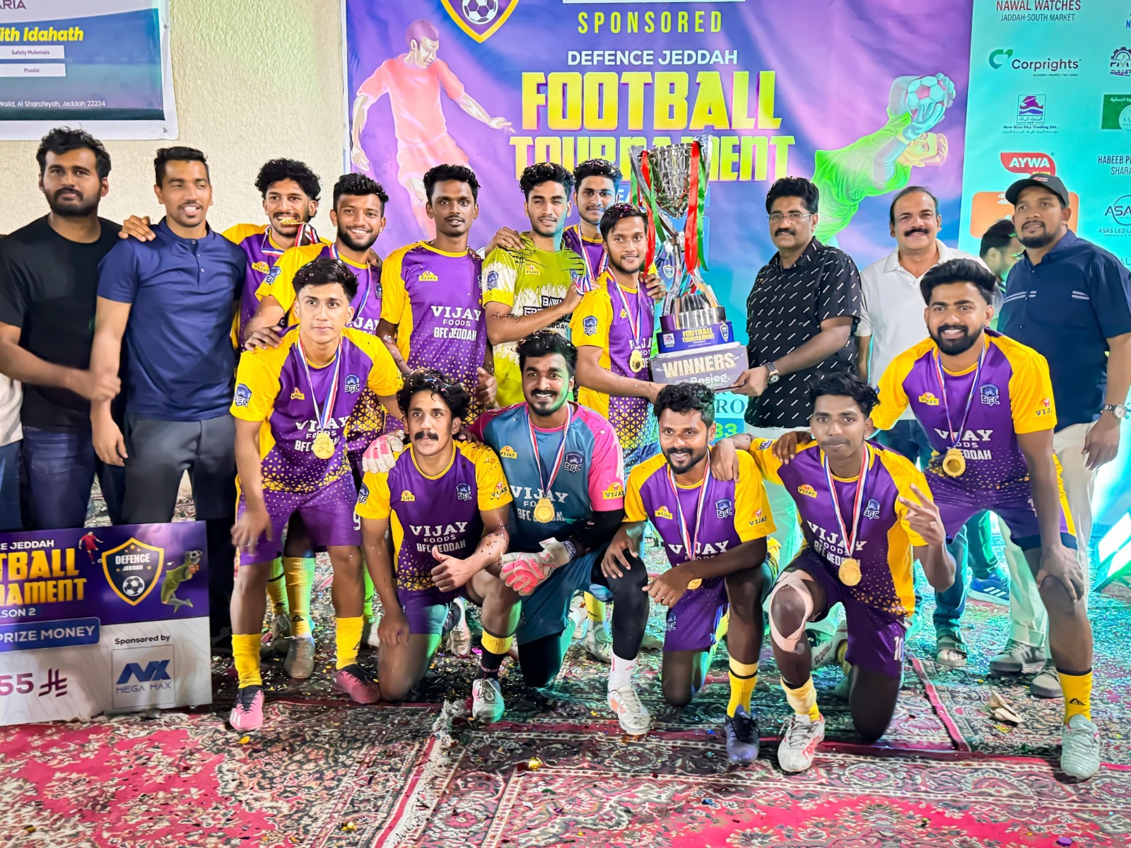 ജിദ്ദ: ജിദ്ദയിലെ ഡിഫെൻസ് ജിദ്ദ ക്ലബ് നടത്തിയ രണ്ടാമത് സെവെൻസ് ഫുട്ബോൾ ടൂർണമെന്റിൽ പ്രമുഖ ഫൂഡ് മസാല കമ്പനിയായ പേര് മാറാത്ത പെരുമ മാറാത്ത വിജയ് മസാല സ്പോൺസർ ചെയ്യുന്ന BFC ജിദ്ദ ജേതാകളായി. ജിദ്ദ ഖാലിദ് ബിന് വലീദ് ഫ്ലഡ് ലൈറ്റ് സ്റ്റേഡിയത്തിൽ രണ്ടു ദിവസങ്ങളിലായി നടന്ന മൽസരസത്തിൽ സൗദി അറേബ്യ യിലെ വിവിധ പ്രേവശ്യകളിനിന്നുള്ള 8 പ്രമുഖ സീനിയർ ക്ലബ്ബുകൾ പങ്കെടുത്തു. ടൂർണമെന്റിൽ സെമി ഫൈനൽ മത്സരത്തിൽ ശക്തരായ ഇതിഹാദ് FC യേയും, ഫൈനലിൽ ശക്തരായ R MAX ലൈറ്റിംഗ് ജിദ്ദ ടീമിനെയുമാണ് വിജയ് ഫൂഡ് BFC ജിദ്ദ നേരിട്ടത്. ടൂർണ്മെന്റിൽ മികച്ച പ്ലയെർ ആയി വിജയ് മസാല BFC ജിദ്ധയുടെ മുഹമ്മദ് സഹീറിനെ തിരഞ്ഞെടുത്തു.