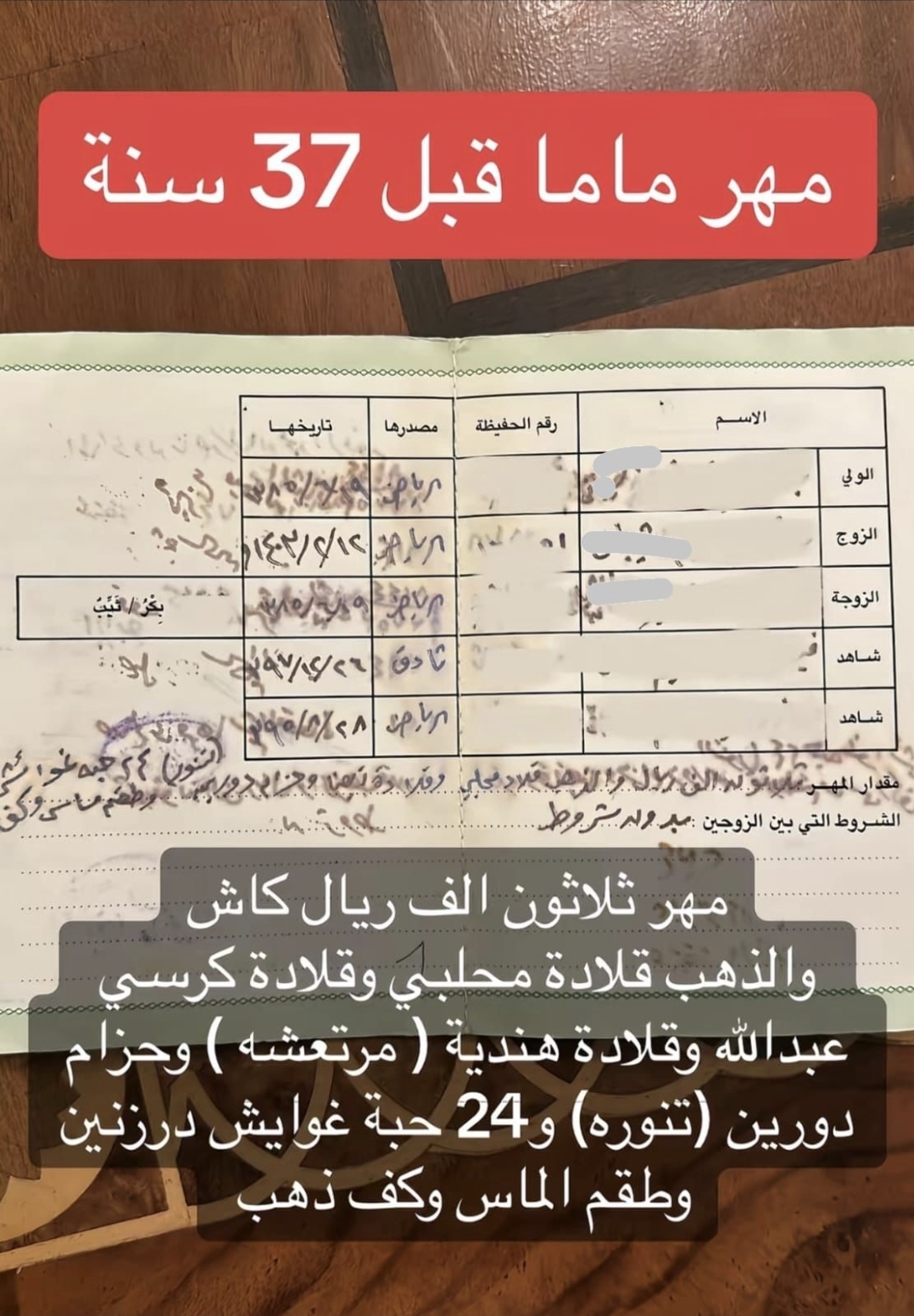 സഊദി പൗരൻ 40 വർഷത്തിലേറെ പഴക്കമുള്ള ഒരു പഴയ വിവാഹ സർട്ടിഫിക്കറ്റ് പ്രസിദ്ധീകരിച്ചതോടെ സോഷ്യൽ മീഡിയയിൽ വൻ ചർച്ച. അത് അക്കാലത്ത് അവളുടെ ഉമ്മയുടെ സ്ത്രീധനത്തിന്റെ വിശദാംശങ്ങൾ വെളിപ്പെടുത്തുന്ന വിവാഹ സർട്ടിഫിക്കറ്റ് അറബ് സോഷ്യൽ മീഡിയകളിൽ വൻ ചർച്ചയാണ്.