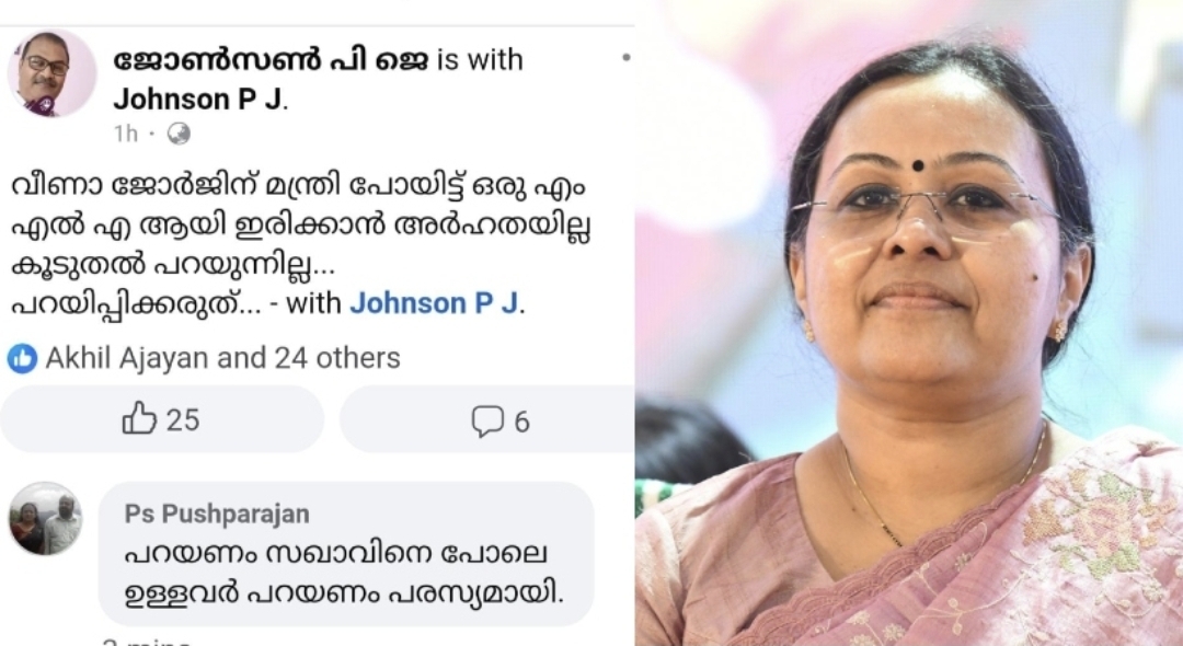 കൂടുതല്‍ പറയുന്നില്ലെന്നും ഇനി പറയിപ്പിക്കരുതെന്നുമായിരുന്നു ജോണ്‍സണ്‍ പിജെ പറഞ്ഞത്. ഒരു എംഎല്‍എയായി ഇരിക്കാന്‍ പോലും മന്ത്രിക്ക് അര്‍ഹതയില്ലെന്നും എല്‍സി അംഗം പറഞ്ഞു. എസ്എഫ്‌ഐ മുന്‍ ജില്ലാ പ്രസിഡന്റ് കൂടിയാണ് ജോണ്‍സണ്‍ പിജെ. മന്ത്രി വീണാ ജോര്‍ജ് ആശുപത്രിയില്‍ ചികിത്സ തേടിയതിനെയായിരുന്നു പത്തനംതിട്ട സിഡബ്ല്യുസി മുന്‍ ചെയര്‍മാന്‍ കൂടിയായ എന്‍ രാജീവ് പരോക്ഷമായി വിമര്‍ശിച്ചത്. സ്‌കൂളില്‍ കേട്ടെഴുത്ത് ഉണ്ടെങ്കില്‍ വയറുവേദന വരുമെന്നും വയറുവേദന എന്ന് പറഞ്ഞ് വീട്ടില്‍ ഇരിക്കുമെന്നുമായിരുന്നു രാജീവ് പരിഹസിച്ചത്. ഒത്താല്‍ രക്ഷപ്പെട്ടു എന്നാണ് അവസ്ഥയെന്നും എന്‍ രാജീവ് പറഞ്ഞു.