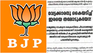 രാജ്യത്ത് അങ്ങോളമിങ്ങോളം ക്രൈസ്തവ വിശ്വാസികൾക്ക് നേരെയുണ്ടാകുന്ന ആക്രമണങ്ങളെ ചൂണ്ടിക്കാട്ടിയാണ് മുഖപ്രസംഗം. ക്രൈ​​​​​​സ്ത​​​​​​വ പീ​​​​​​ഡ​​​​​​ന​​​​​​ങ്ങ​​​​​​ളോ​​​​​​ട് അ​​​​​​രു​​​​​​തെ​​​​​​ന്ന് പ​​​​​​റ​​​​​​യാ​​​​​​തെ​​​​​​യാ​​​​​​ണ് 2026ൽ ​​​​​​കേ​​​​​​ര​​​​​​ള​​​​​​ത്തി​​​​​​ൽ ഭ​​​​​​ര​​​​​​ണം പി​​​​​​ടി​​​​​​ക്കാ​​​​​​ൻ ബി​​​​​​ജെ​​​​​​പി ക​​​​​​ച്ച​​​​​​കെ​​​​​​ട്ടി​​​​​​യി​​​​​​റ​​​​​​ങ്ങി​​​​​​യി​​​​​​രി​​​​​​ക്കു​​​​​​ന്ന​​​​​​തെന്ന് ദീപിക വിമർശിക്കുന്നു.