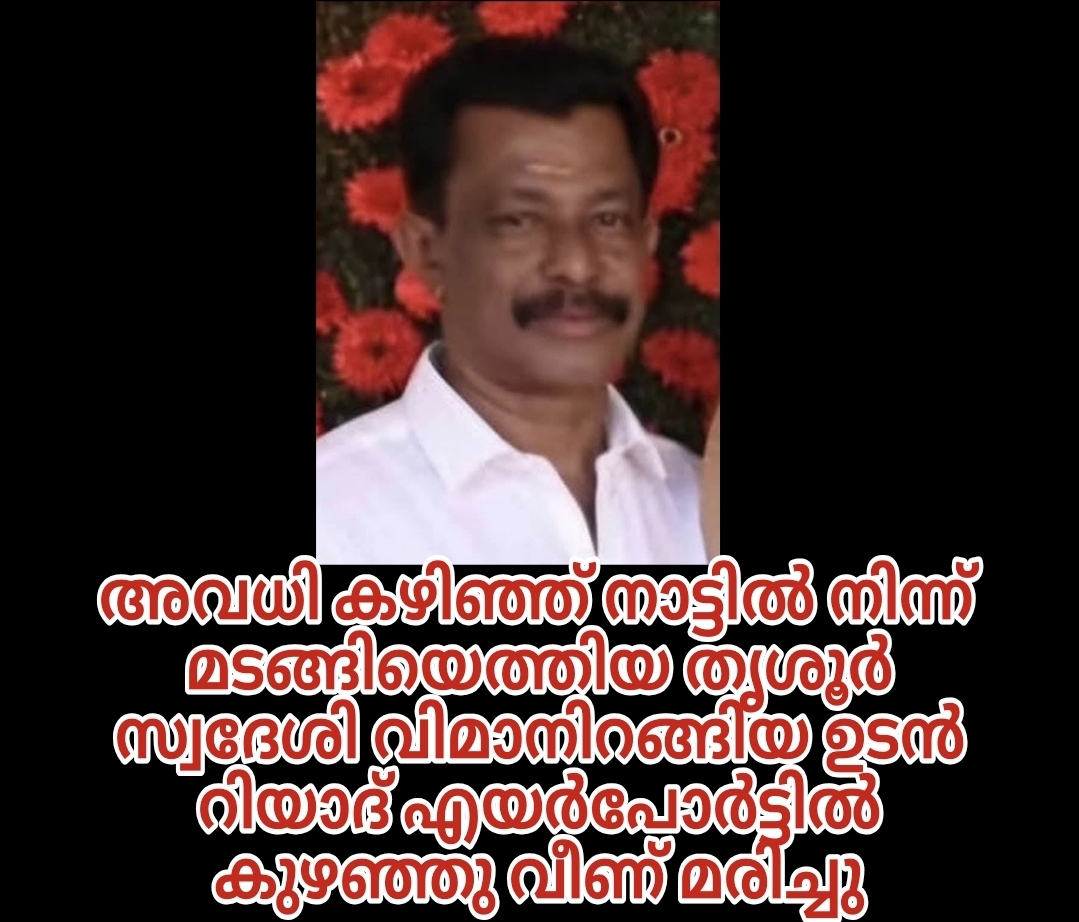 അവധി കഴിഞ്ഞ് റിയാദിൽ വിമാനിറങ്ങിയ ഉടൻ തൃശ്ശൂർ സ്വദേശി എയർപോർട്ടിൽ കുഴഞ്ഞു വീണ് മരിച്ചു