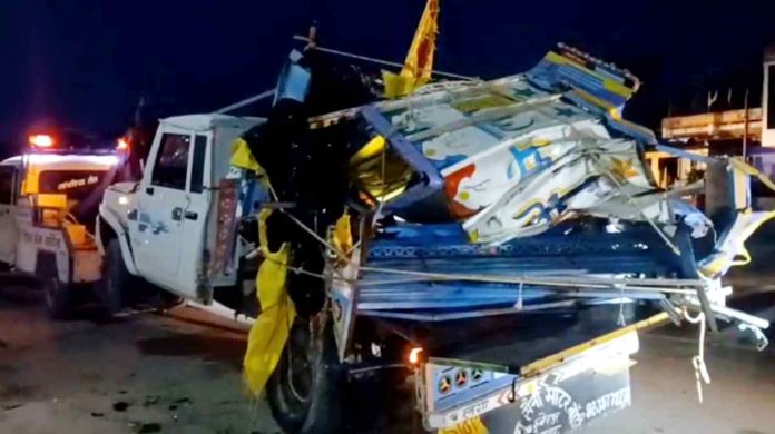 **EDS: SCREENSHOT VIA VIDEO** Dausa: Wreckage of a vehicle being taken away after a pickup van allegedly crashed into a parked truck, in Rajasthan's Dausa district, Wednesday, Aug. 13, 2025. At least 11 people were killed, including seven children, and eight suffered injuries in the accident, according to officials. (PTI Photo)(PTI08_13_2025_000020B)
