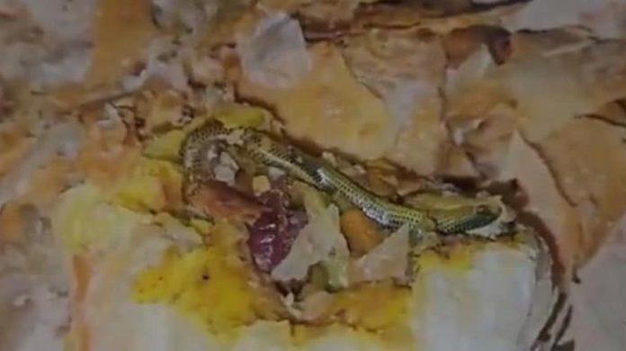നാലുമണി പലഹാരമായി വാങ്ങി വീട്ടില് കൊണ്ടുപോയ പഫ്സിനുള്ളില് ചത്ത പാമ്പിന്കുഞ്ഞിനെ കണ്ടെത്തിയെന്ന് യുവതിയുടെ പരാതി. തെലങ്കാനയിലെ മഹാബൂബ്നഗറിലാണ് സംഭവം. ജട്ചര്ല മുന്സിപ്പാലിറ്റിയിലെ അയ്യങ്കാര് ബേക്കറിയില് നിന്നാണ് താന് ഒരു മുട്ട പഫ്സും കറി പഫ്സും വാങ്ങിയതെന്നാണ് യുവതിയുടെ പരാതിയില് പറയുന്നത്. വീട്ടിലെത്തി മക്കളുമായിരുന്ന് കഴിക്കാന് നേരം വെറുതേ തുറന്ന് നോക്കിയപ്പോഴാണ് പഫ്സിനുള്ളില് ചത്ത പാമ്പിന്കുഞ്ഞിനെ കണ്ടതെന്ന് ശ്രീശൈല പറയുന്നു.
